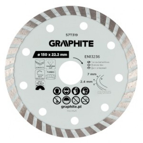 Disc de taiere turbo diamantat, 150 x 22,2 mm, uscat 57T319 de la GRAPHITE este un disc de taiere turbo uscat cu un diametru de 150 mm si o gaura de montare de 22,2 mm. Este inclus un inel de reducere practic. Segmentul de taiere este de 7 mm inaltime si 2,4 mm latime. Viteza maxima a discului este de 10 000 rpm, corespunzind la 80 m/s. Discul GRAPHITE indeplineste cerintele EN 13236 si este proiectat pentru taierea pietrei, caramizii, marmurei, granitului si betonului].