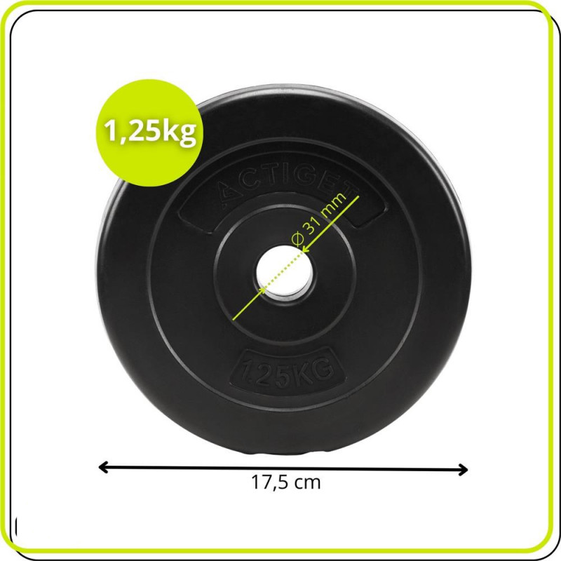 Scurta descriere: Disc greutate de 1,25 kg potrivit pentru ajustarea fina a incarcarii in antrenamentele de forta. Fabricat din compozit cu acoperire rezistenta din PP si umplere cu ciment, asigura durabilitate si stabilitate in utilizare. Compatibil cu bare si gantere cu diametru de 31 mm.
