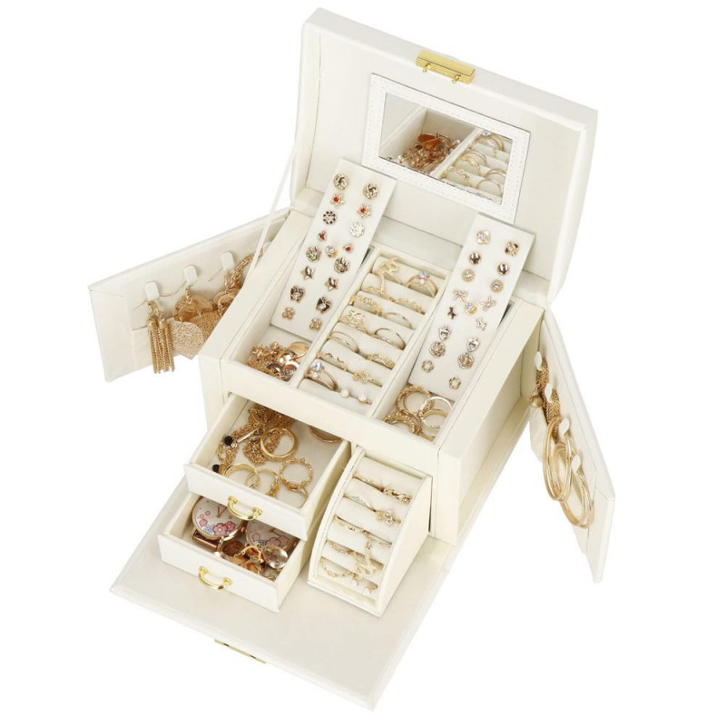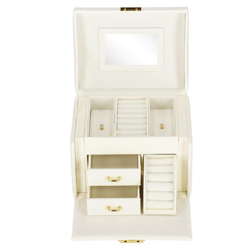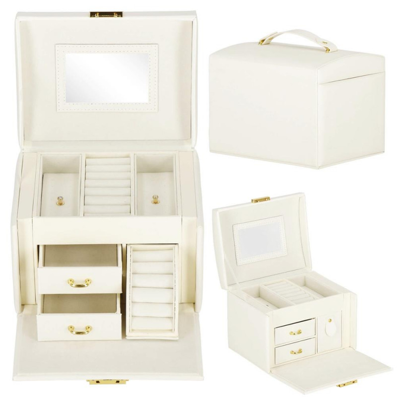 Setul include: o cheie pentru a asigura securitatea cutiei Fiecare femeie iubeste bijuteriile. Le poate purta in fiecare zi, la petreceri, la ocazii speciale in doi. Dar unde sa le pastram, astfel incat sa nu se piarda sau sa se incurce? O cutie de bijuterii este o idee grozava pentru depozitarea accesoriilor valoroase! Cu ajutorul ei, totul va fi intotdeauna la locul lui. Cutia are spatiu de depozitare suplimentar in sertarele inferioare. Acest lucru va permite sa depozitati mai multe bijuterii in interior. In plus, peretii laterali ai cutiei se deschid, acolo veti gasi carlige pentru agatarea pandantivelor sau colierelor si un buzunar cu banda elastica.Cutia de bijuterii va va permite sa va organizati corespunzator locul pentru accesoriile de styling. Isi va gasi locul intr-un dulap, pe o masuta de toaleta sau pe o comoda. Avand toate bijuteriile preferate intr-un singur loc, puteti uita de cautarea unui alt cercel care s-a pierdut pe undeva sau sa desfaci colierul. Atunci cand plecati intr-o calatorie lunga, merita sa va echipati cu un organizator de bijuterii, astfel incat sa nu se piarda nimic atunci cand despachetati. Datorita dimensiunii sale compacte, se va potrivi cu usurinta si in bagajul dumneavoastra.