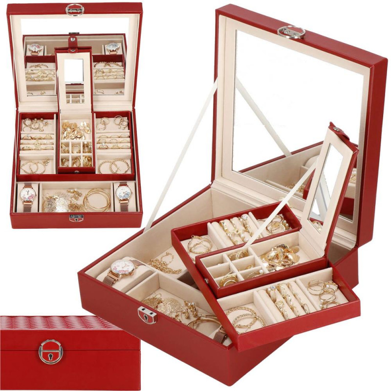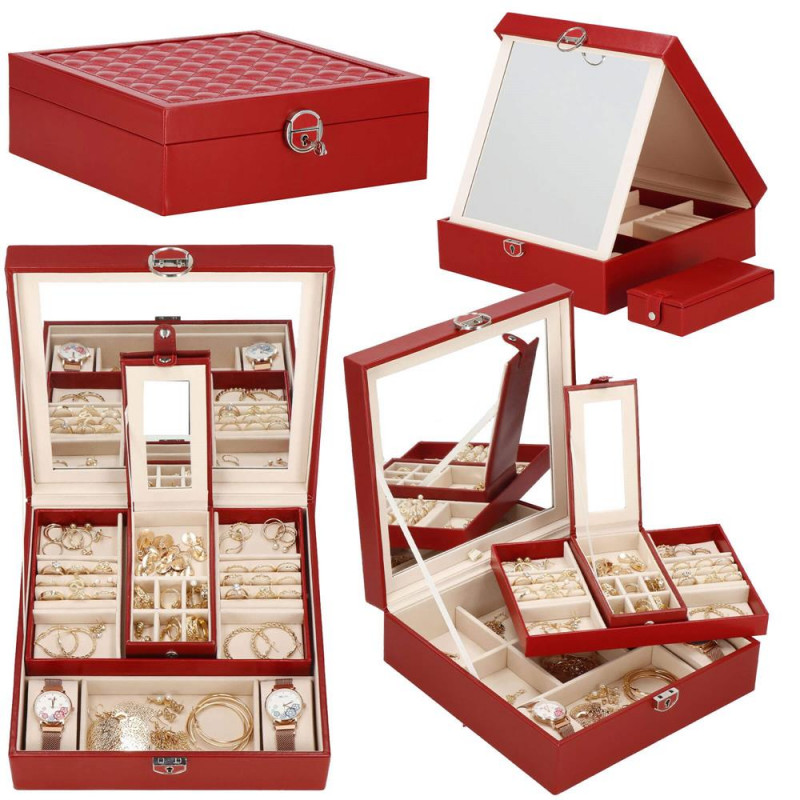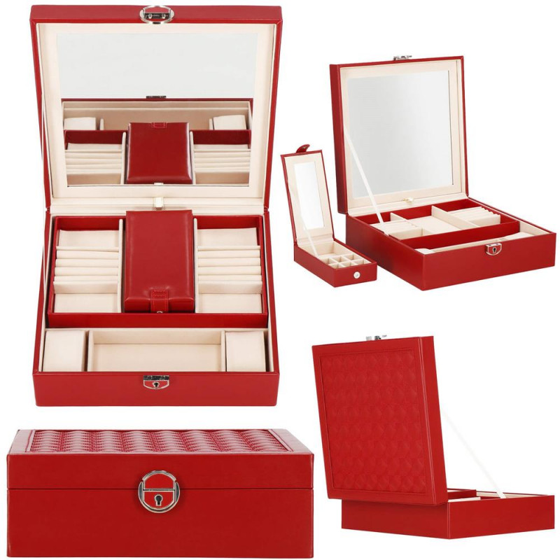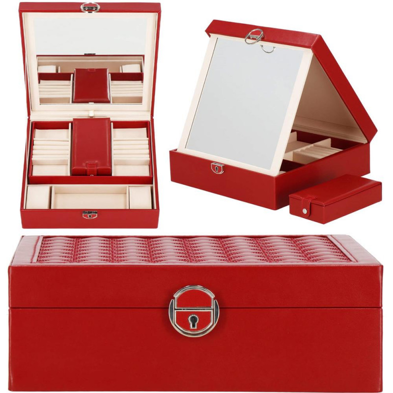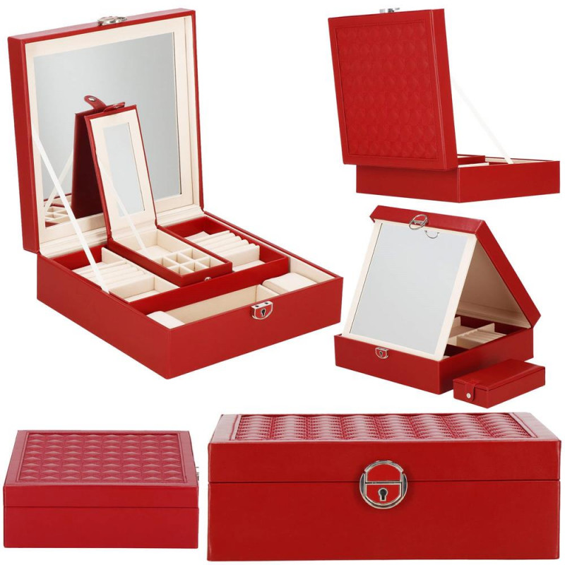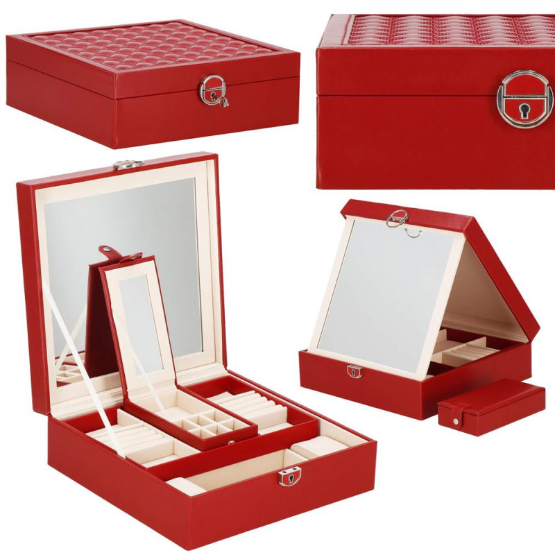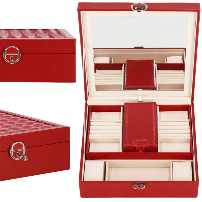 setul include: o cheie pentru a asigura securitatea cutiei Fiecare femeie iubeste bijuteriile. Le poate purta in fiecare zi, la petreceri, la ocazii speciale in doi. Dar unde sa le pastram, astfel incat sa nu se piarda sau sa se incurce? O cutie de bijuterii este o idee grozava pentru depozitarea accesoriilor valoroase! Cu ajutorul ei, totul va fi intotdeauna la locul lui. Cutia de bijuterii va va permite sa va organizati corespunzator locul pentru accesoriile de styling. Isi va gasi locul intr-un dulap, pe o masuta de toaleta sau pe o comoda. Avand toate bijuteriile preferate intr-un singur loc, puteti uita de cautarea unui alt cercel care s-a pierdut pe undeva sau sa desfaci colierul. Atunci cand plecati intr-o calatorie lunga, merita sa va echipati cu un organizator de bijuterii, astfel incat sa nu se piarda nimic atunci cand despachetati. Datorita dimensiunii sale compacte, se va potrivi cu usurinta si in bagajul dumneavoastra.