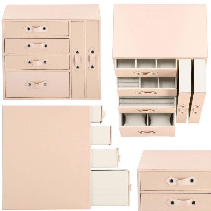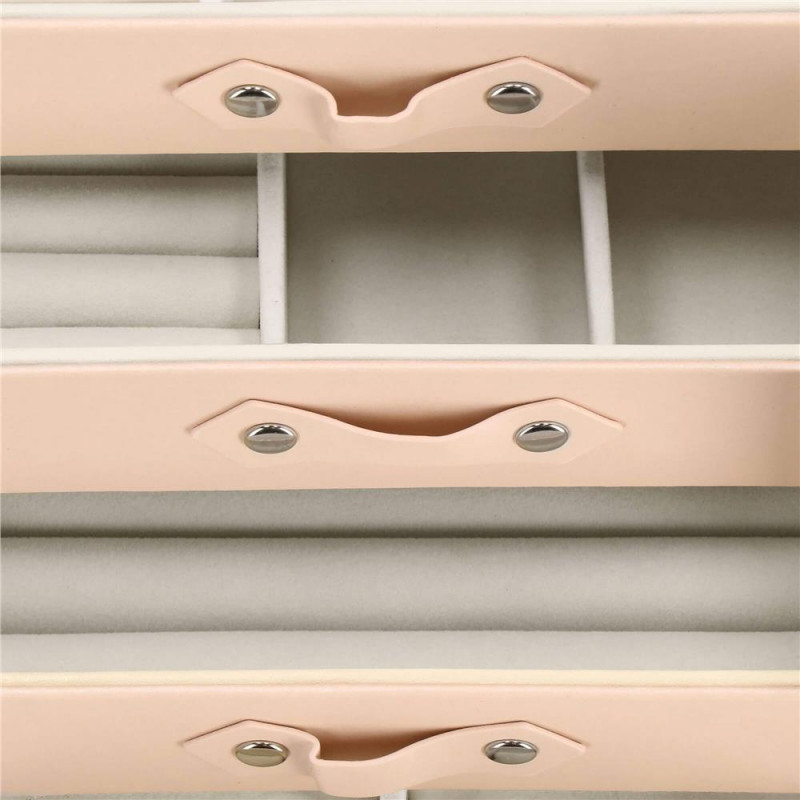 In interiorul cutiei: 1 sertar mare: 9 compartimente, dimensiuni: 5,5 x 5 cm1 sertar mare: 10 compartimente pentru inele / 4 compartimente, dimensiuni: 8 x 4,5 cm1 sertar mare: 9 compartimente pentru inele1 sertar cel mai mare: 4 compartimente cu perne pentru bratari / ceasuri / dimensiuni compartiment: 8 x 8 x 5 cm1 sertar lateral cu doua fete: 10 suporturi pentru pandantiv / colier + 2x plasa elastica cu banda elastica1 sertar lateral: 2 pandantiv / suporturi de colier + plasa laterala / 3 bretele detasabile pentru cercei Dimensiuni perne/bratara ceas: lungime: 7,5 cmlatime: 7,5 cminaltime: 4 cm