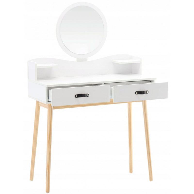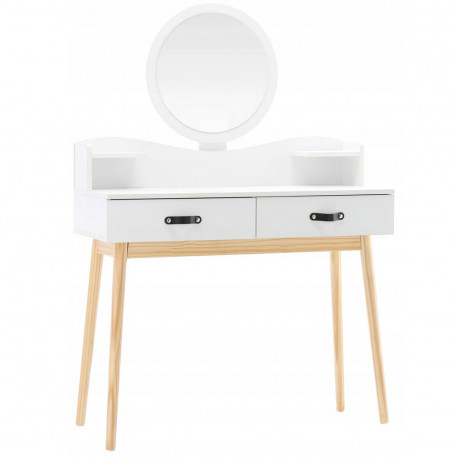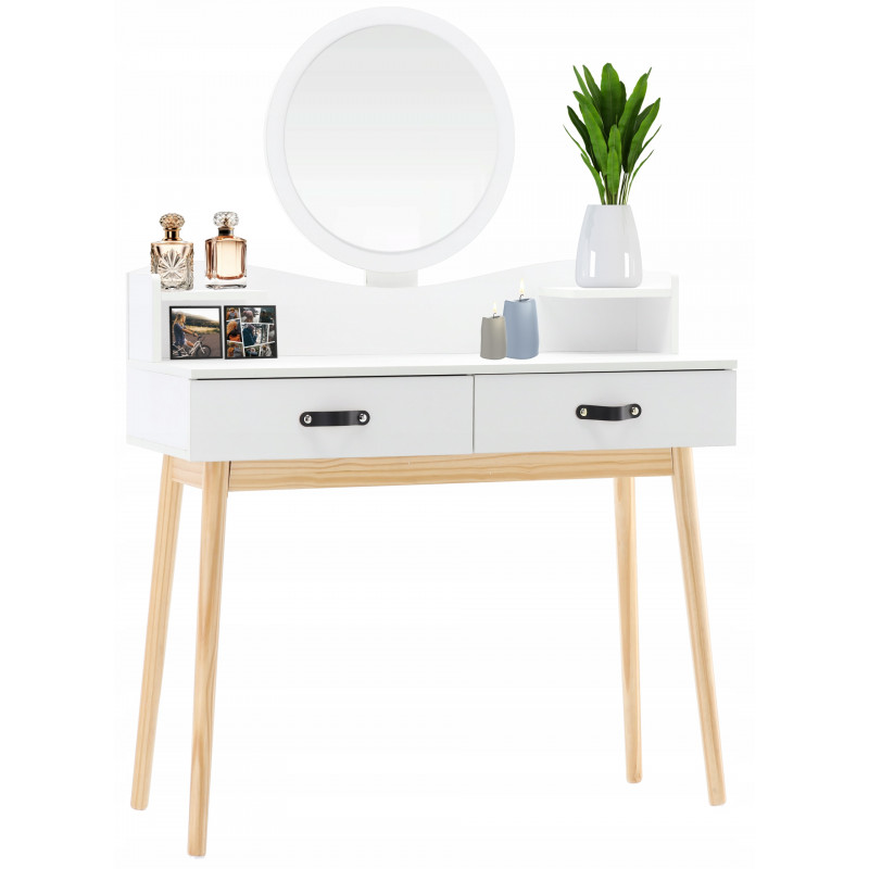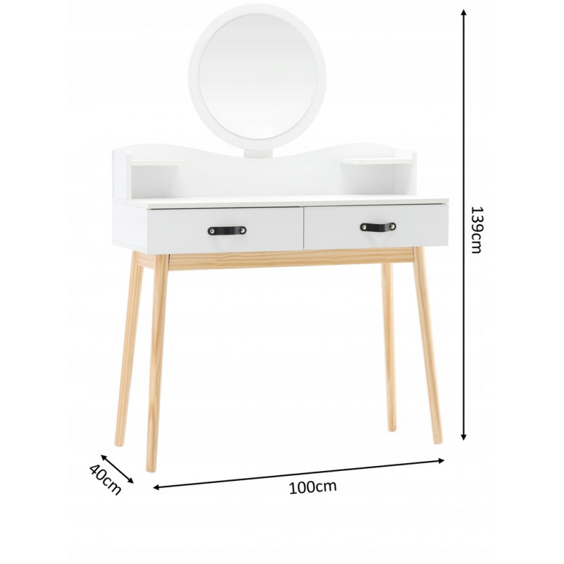 Inaltime: 139 cm O masuta de toaleta eleganta este piesa de mobilier perfecta pentru dormitor, fiind un loc practic pentru machiaj, coafura, ingrijirea zilnica a frumusetii, precum si pentru a scrie o scrisoare sau pentru a depozita o varietate de obiecte mici. Eleganta si functionalitate Designul simplu, scandinav, al mesei de toaleta se distinge prin simplitate si minimalism, caracteristice stilului scandinav. Culorile stralucitoare, materialele naturale si formele ergonomice creeaza un intreg armonios. Oglinda rotunda Punctul central al mesei de toaleta este o oglinda rotunda , care adauga farmec si functionalitate. Datorita acesteia, iti poti controla aspectul din toate partile, ceea ce face ingrijirea zilnica si pregatirea pentru zi mai usoara. Sertare si rafturi practice Masuta de toaleta are 2 sertare in care puteti depozita cosmetice, bijuterii si alte articole necesare si 2 rafturi . Instalare usoara Asamblarea masutei de toaleta este simpla si rapida , asa ca te vei putea bucura de ea in dormitorul tau in scurt timp. Toate elementele de asamblare necesare sunt incluse in set, iar