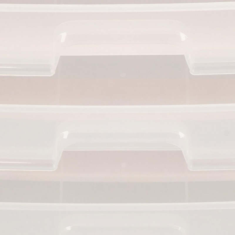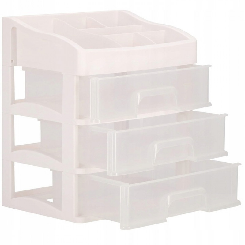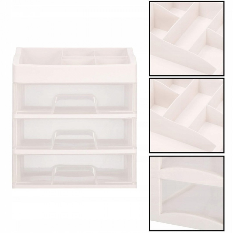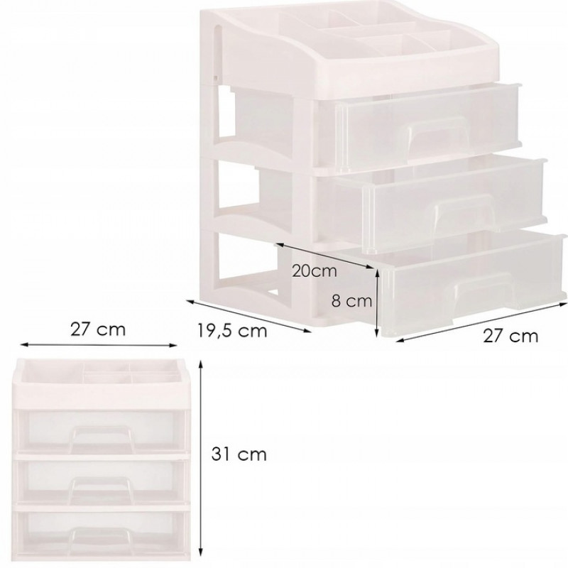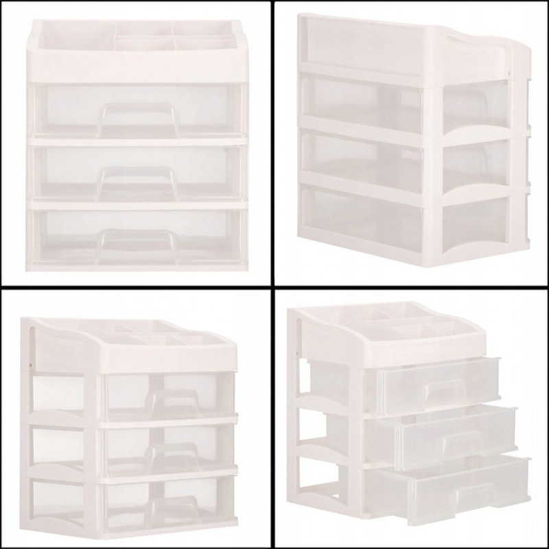 3x sertare transparente cu maner de aceeasi dimensiune (adancime: 20 cm, latime: 27 cm, inaltime: 8 cm) Organizatoarele fac sarcinile zilnice incredibil de usoare si pastreaza lucrurile ordonate. Puteti uita deja de cautarea zilnica a rujului, a pudrei sau a altor produse cosmetice.