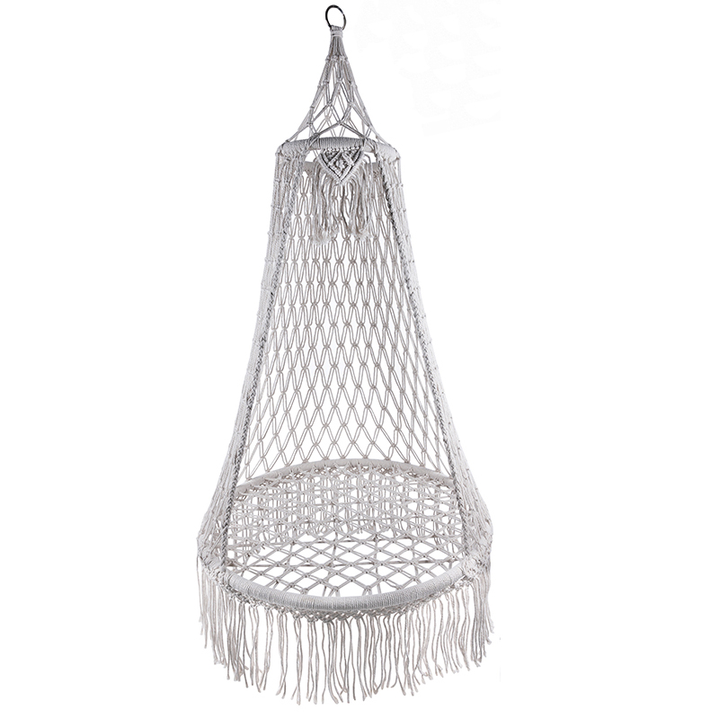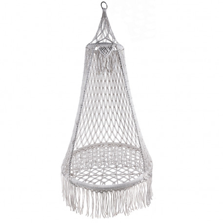 Material: bumbac + otel galvanizat + poliester Scaun de gradina suspendat pentru terasa sau balcon, realizat din franghie rezistenta si cercuri metalice. Elementele de fixare solide asigura siguranta. Fotoliul are un baldachin realizat din tesatura impletita solida.