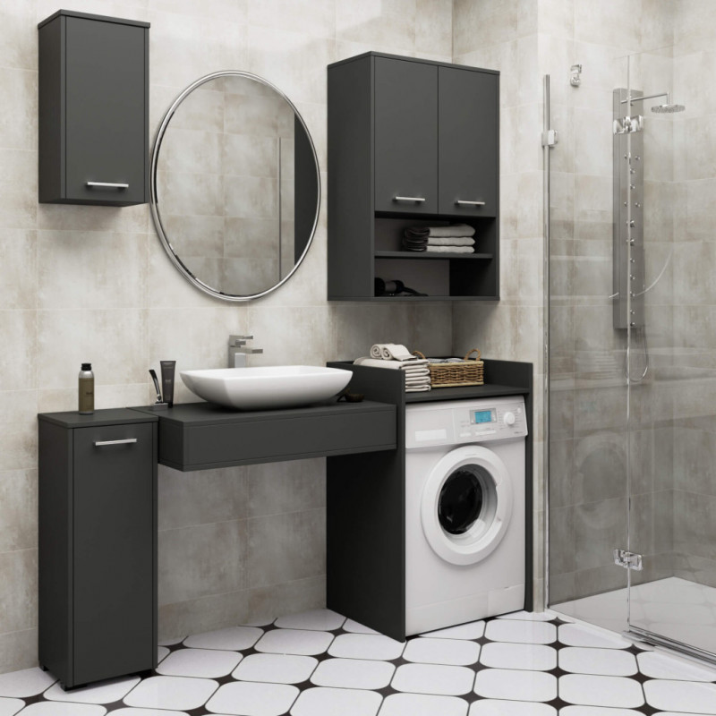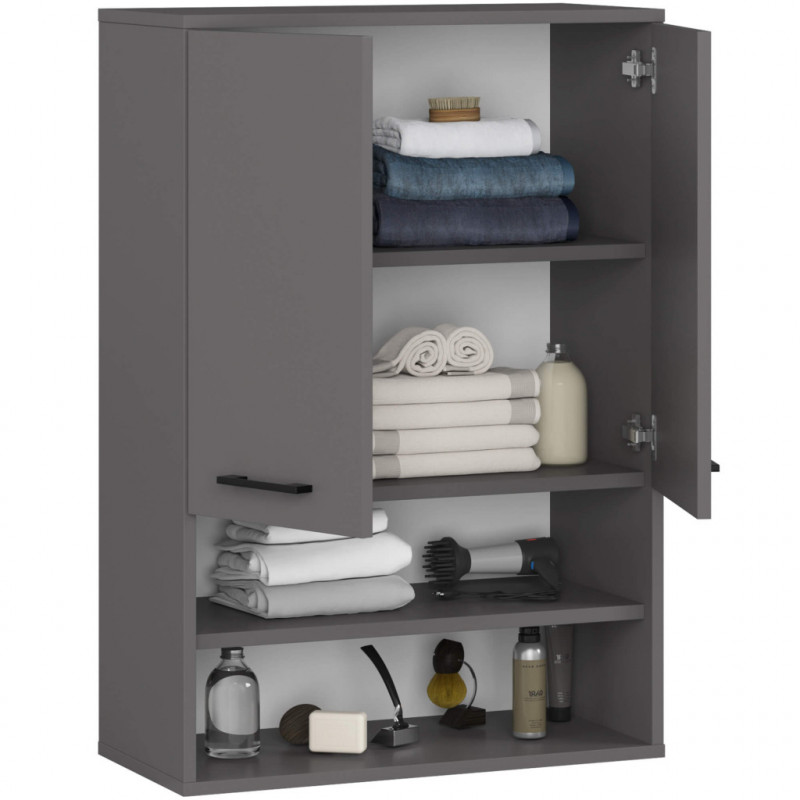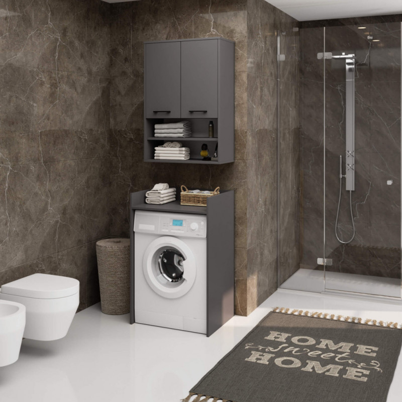 Scurta descriere: Dulapul suspendat FIN H934 W64 in finisaj grafit gri aduce un aspect modern si elegant baii tale. Realizat din PAL laminat de 16 mm, cu canturi protejate ABS, este rezistent si potrivit pentru utilizare zilnica. Dispune de 2 usi si 4 rafturi interioare pentru organizare eficienta si poate fi montat deasupra masinii de spalat sau langa un corp inferior.