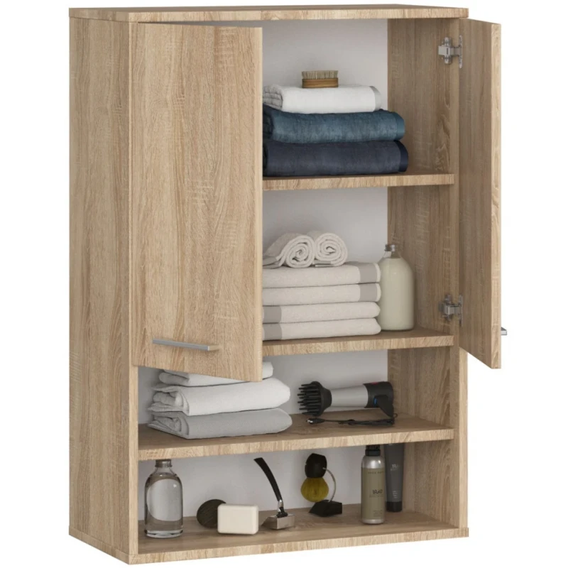 Scurta descriere: Dulapul suspendat FIN H934 W64 in finisaj stejar sonoma este o solutie practica si eleganta pentru baie. Fabricat din PAL laminat de 16 mm, cu canturi protejate ABS, ofera rezistenta sporita la utilizare zilnica. Dispune de 2 usi si 4 rafturi pentru organizare eficienta, fiind ideal pentru montaj deasupra masinii de spalat sau langa un corp inferior.
