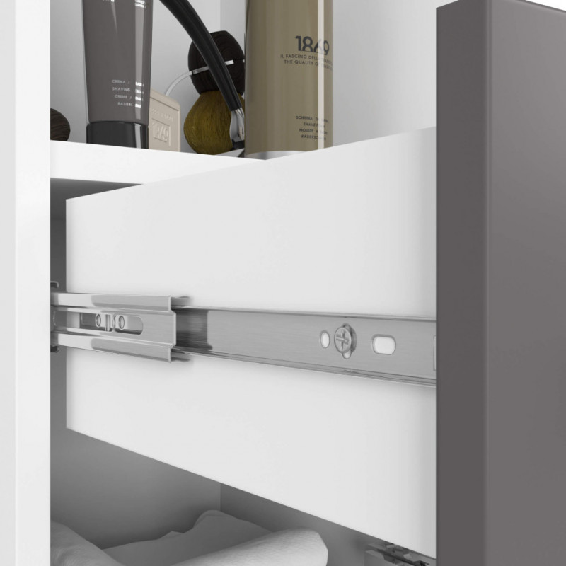 Scurta descriere Dulapul inalt FIN alb/grafit este o alegere practica si eleganta pentru orice baie, indiferent de dimensiune. Ofera spatiu generos de depozitare datorita celor doua usi, sertarului central si rafturilor interioare, fiind ideal pentru prosoape, cosmetice sau produse de curatenie. Designul modern in finisaj mat alb si gri se potriveste perfect atat in bai minimaliste, cat si in interioare clasice.