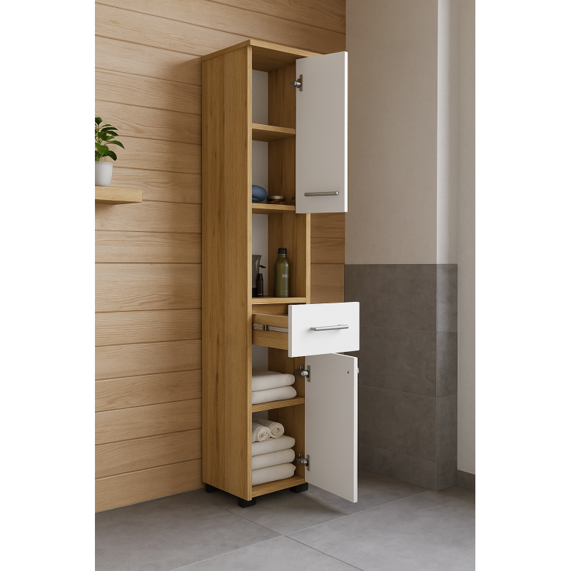 Scurta descriere: Dulapul FIN in nuanta stejar artisan aduce un plus de caldura si eleganta baii tale. Functional si modern, include doua usi, un sertar si rafturi interioare ce ofera spatiu amplu pentru organizarea produselor de ingrijire, prosoapelor sau accesoriilor. Construit din PAL laminat rezistent la umiditate, este ideal atat pentru montaj suspendat, cat si pentru amplasare pe podea.