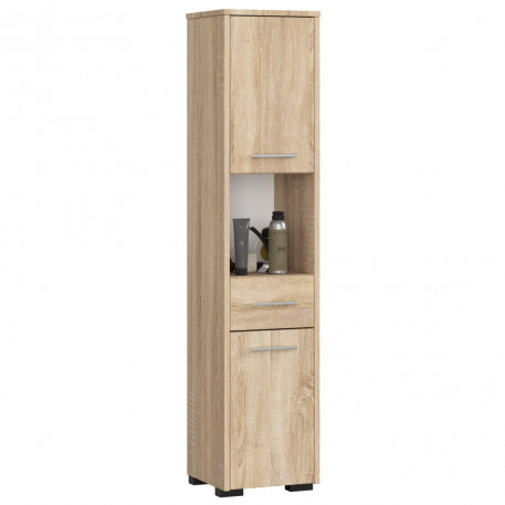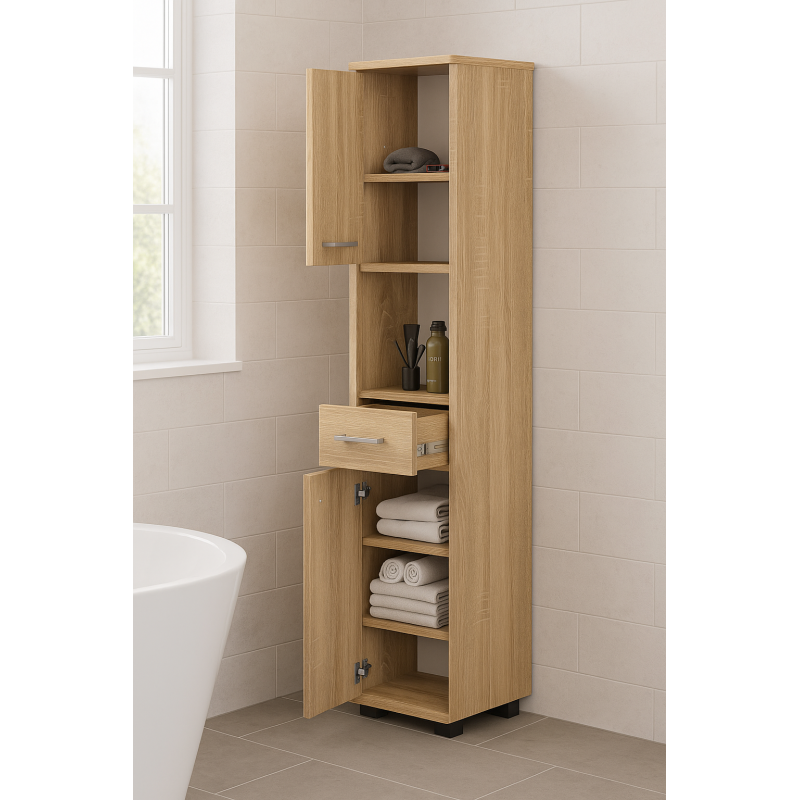 Scurta descriere: Dulapul FIN in nuanta stejar sonoma aduce caldura si stil natural in orice baie moderna. Functional si compact, include doua usi, un sertar si rafturi interioare pentru depozitarea eficienta a produselor de ingrijire, prosoapelor sau articolelor de curatenie. Realizat din PAL laminat rezistent la umiditate, este ideal atat pentru montaj pe podea, cat si suspendat.