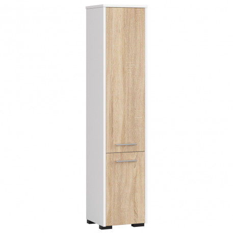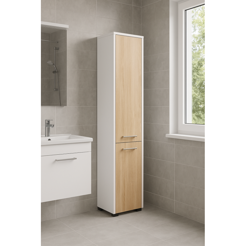 Scurta descriere Dulapul FIN este o piesa functionala si moderna, ideala pentru bai de orice dimensiune. Poate fi montat pe perete sau asezat pe podea, oferind flexibilitate maxima in amenajare. Construit din PAL laminat rezistent, combina nuantele calde de stejar sonoma cu albul mat, aducand un aspect luminos si natural incaperii.