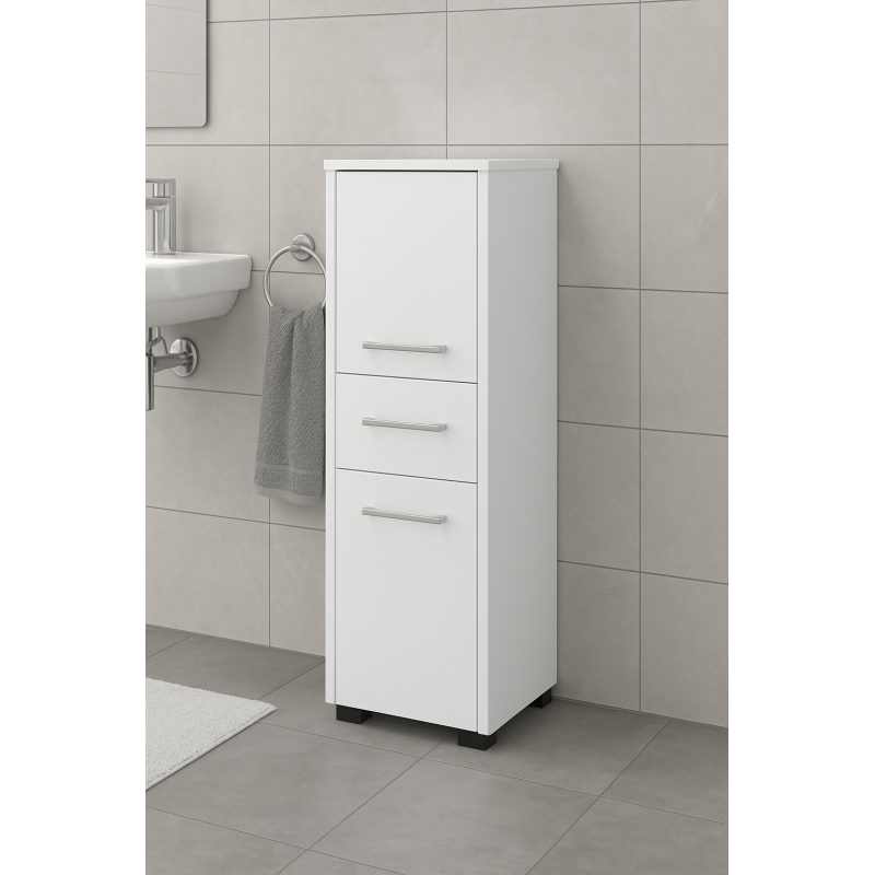 Scurta descriere: Dulapiorul de baie FIN este o solutie practica pentru organizarea eficienta a spatiului. Cu doua usi, un sertar si trei polite interioare, ofera loc suficient pentru depozitarea prosoapelor, cosmeticelor si accesoriilor de baie. Realizat din PAL laminat rezistent la uzura, cu margini protejate prin banda ABS, dulapiorul are un finisaj alb mat elegant si poate fi montat atat suspendat, cat si asezat pe podea.