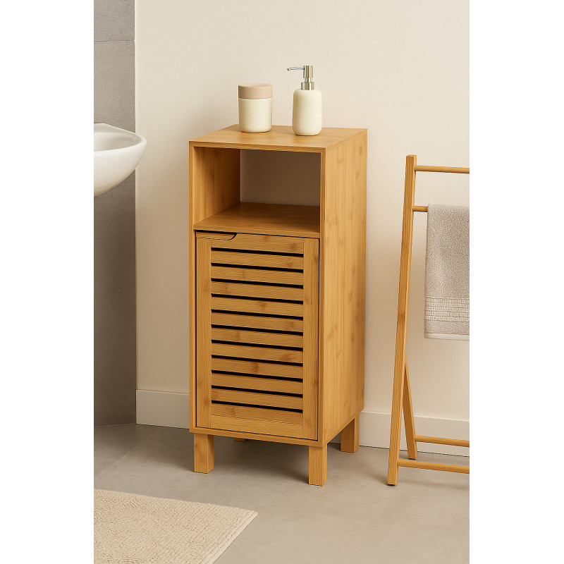 Scurta descriere Dulapiorul de baza Sicela din bambus si MDF este o piesa compacta si functionala, perfecta pentru spatii mici precum baia sau holul. Designul vertical si caldura lemnului natural aduc un plus de stil si utilitate, oferind spatii de depozitare deschise pentru obiecte de uz zilnic.