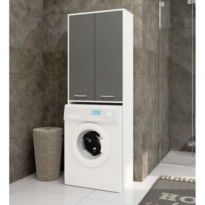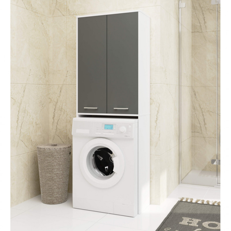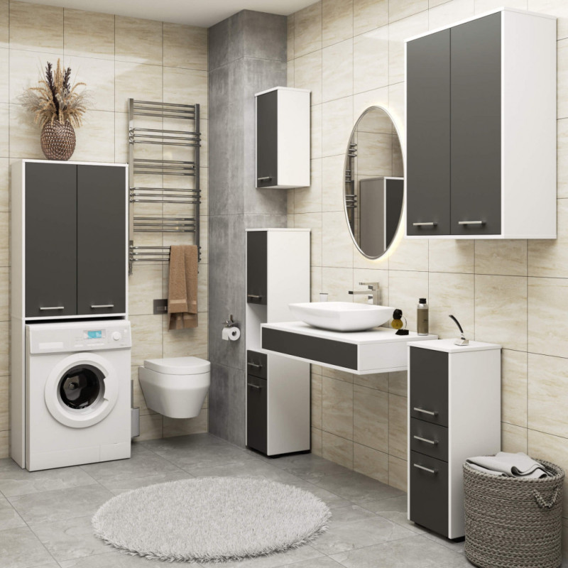 Scurta descriere: Dulapul de baie FIN in combinatia alb/grafit este o solutie moderna si practica pentru utilizarea spatiului de deasupra masinii de spalat. Fabricat din PAL melaminat Kronospan de 16 mm, acest dulap ofera durabilitate, rezistenta la umiditate si un aspect elegant. Cele doua usi pline ascund patru rafturi incapatoare, ideale pentru prosoape, detergenti sau produse cosmetice. Finisajul mat si manerele argintii confera un design contemporan, potrivit atat pentru bai moderne, cat si clasice.