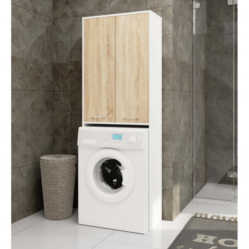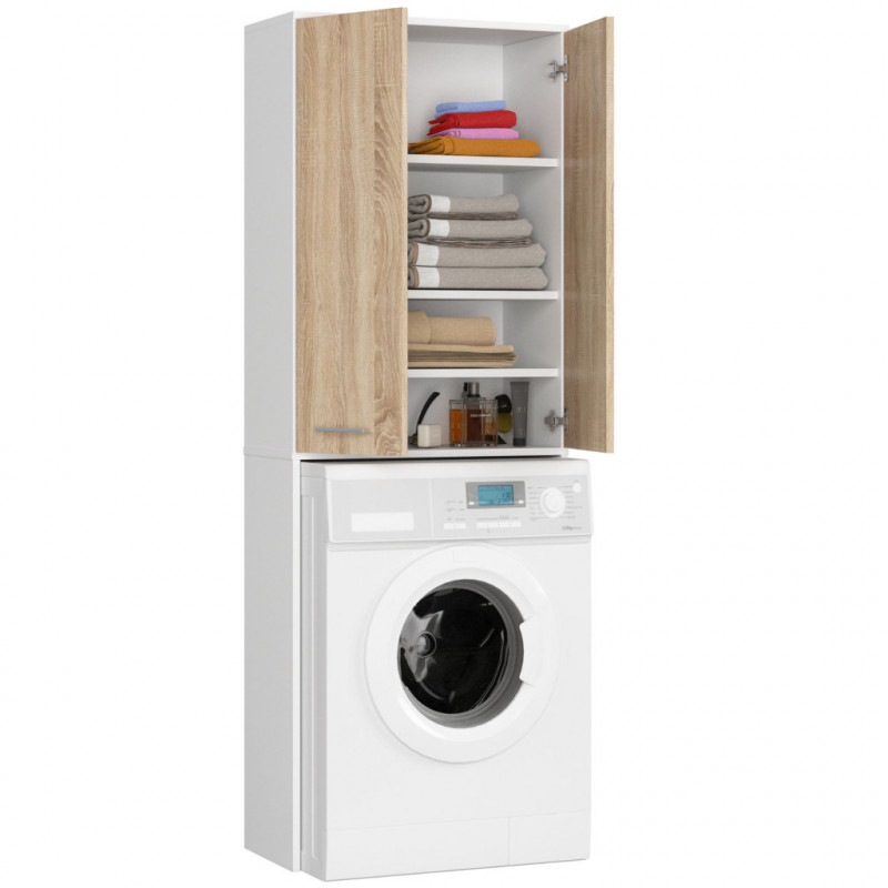Scurta descriere: Dulapul de baie FIN in combinatie alb/stejar sonoma este o solutie practica si eleganta pentru organizarea spatiului de deasupra masinii de spalat. Fabricat din PAL melaminat Kronospan de 16 mm, ofera durabilitate si rezistenta la umiditate, pastrandu-si aspectul modern in timp. Cele doua usi pline ascund patru rafturi spatioase ideale pentru depozitarea prosoapelor, produselor de curatenie sau accesoriilor de baie. Finisajul mat si marginile protejate cu cant ABS adauga un plus de eleganta si protectie.