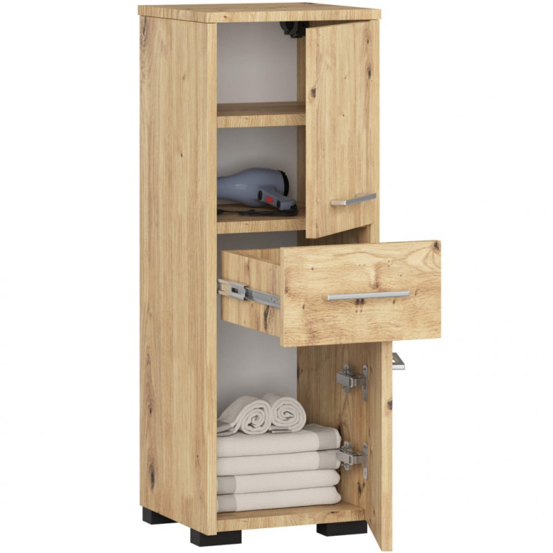 Scurta descriere: Etajera de baie FIN este realizata din PAL laminat Kronospan de 16 mm, rezistent la umezeala si zgarieturi. Marginile sunt protejate cu okleina ABS, un material durabil ce impiedica deteriorarea si prelungeste durata de viata a mobilierului. Designul compact ofera spatiu util pentru depozitare: doua compartimente inchise, un sertar central si rafturi interne pentru organizare eficienta. Poate fi folosita suspendata sau ca mobilier de podea, in functie de spatiul disponibil. Finisajul in nuanta calda de stejar artisan adauga eleganta si naturalete baii.