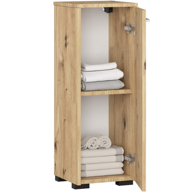 Scurta descriere Acest dulap de baie FIN imbina naturaletea nuantei stejar artisan cu un design simplu si functional, perfect pentru spatii mici. Constructia din PAL laminat rezistent la uzura si umezeala asigura durabilitate, iar usa reversibila permite montajul in functie de configuratia baii. Cu doua compartimente interioare practice, dulapul ofera spatiu suficient pentru depozitarea prosoapelor, cosmeticelor sau accesoriilor zilnice.
