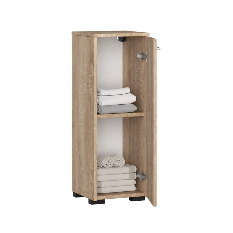 Scurta descriere Acest dulap de baie FIN este o solutie practica si eleganta pentru depozitarea articolelor de baie. Cu un design simplu si finisaj natural stejar sonoma, se potriveste perfect atat in interioare moderne, cat si in bai clasice. Constructia din PAL laminat rezistent la uzura ofera durabilitate, iar usa reversibila permite montajul adaptat spatiului disponibil.