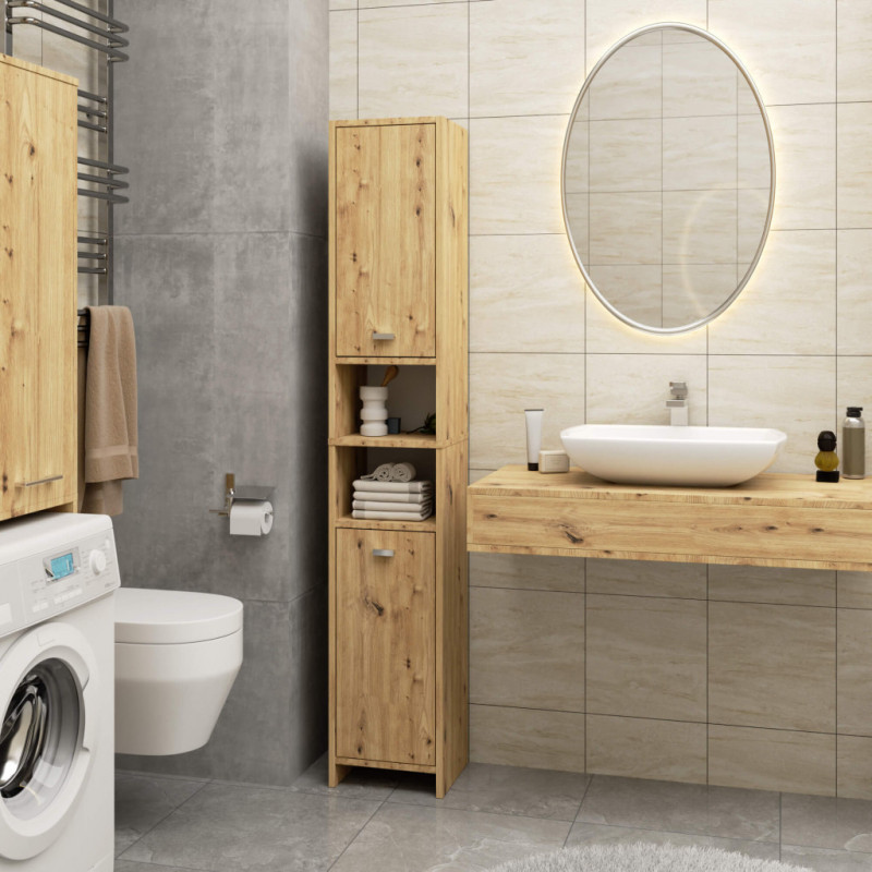 Scurta descriere Acest dulap de baie BETI imbina stilul natural cu functionalitatea. Realizat din PAL laminat rezistent la uzura, in nuanta calda de stejar artisan, ofera patru rafturi interioare spatioase si doua usi pline, ideale pentru depozitarea ordonata a produselor de baie. Datorita marginilor protejate cu SOF si finisajului mat, dulapul este durabil, stabil si usor de intretinut.