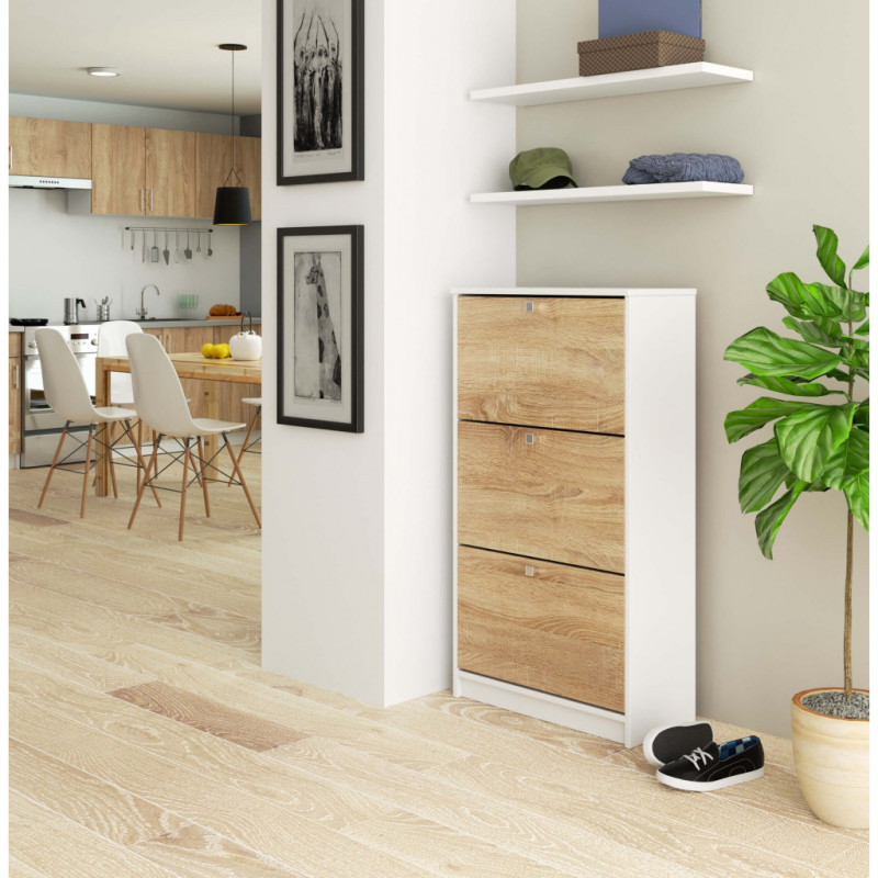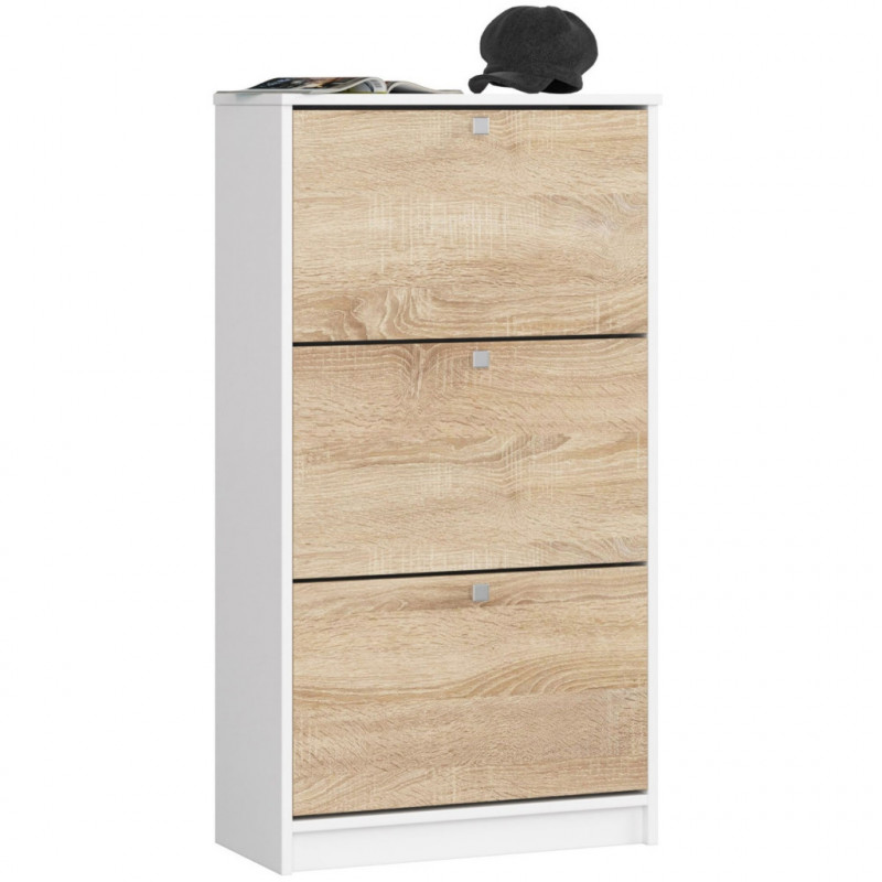Scurta descriere Pantofarul cu trei usi rabatabile, in combinatie alb cu sonoma, ofera o solutie spatioasa pentru organizarea incaltamintei. Cele trei cosuri duble permit depozitarea unui numar mare de perechi, iar structura din pal laminat rezistent si canturile ABS asigura durabilitate. Designul modern si formatul ingust il fac potrivit pentru holuri de orice dimensiune.