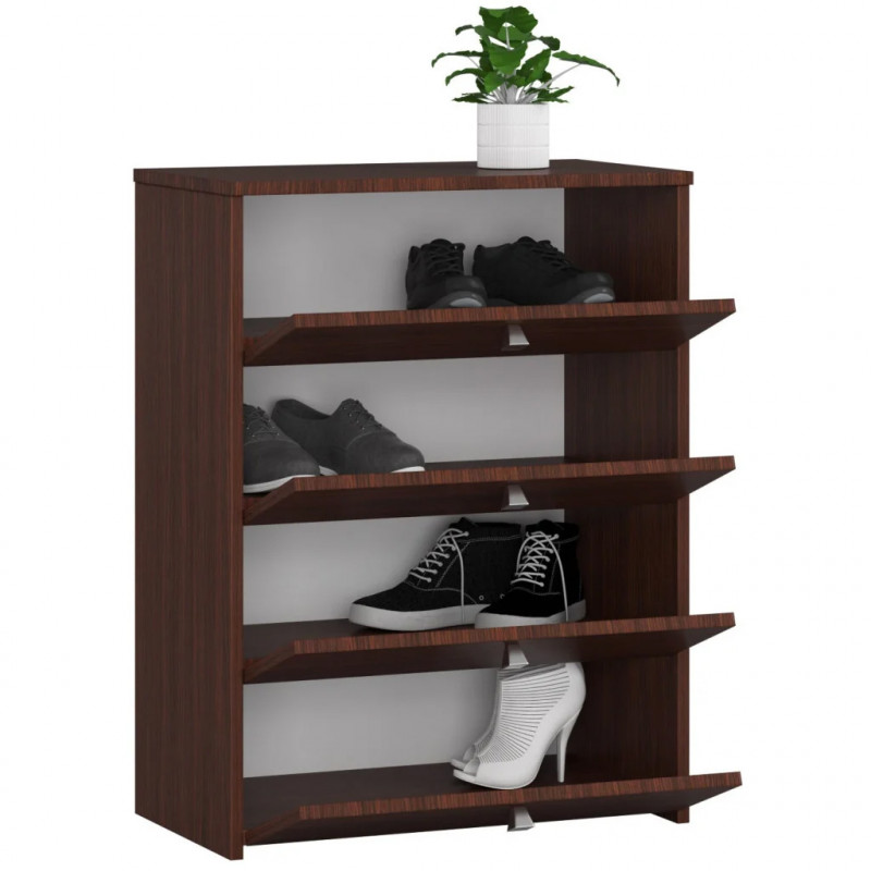 Scurta descriere Pantofar practic de 60 cm, ideal pentru organizarea eficienta a incaltamintei in hol. Cele 4 usi rabatabile ascund rafturi incapatoare, oferind spatiu pentru pana la 12 perechi de incaltaminte. Realizat din pal laminat de 16 mm, rezistent la uzura, cu margini protejate prin cant ABS. Nuanta maro inchis adauga un aspect elegant si usor de integrat in decoruri clasice sau moderne.