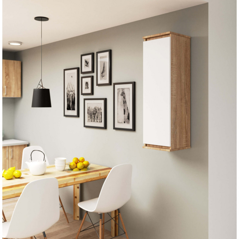 Scurta descriere Dulapul suspendat CLP sonoma/alb este o alegere moderna si eleganta pentru spatii contemporane. Combinatia dintre textura naturala stejar sonoma si fronturile albe mate creeaza un contrast rafinat, potrivit pentru living, birou sau dormitor. Cu trei rafturi interioare spatioase, dulapul ofera un spatiu de depozitare practic si bine organizat, pastrand in acelasi timp un aspect minimalist.