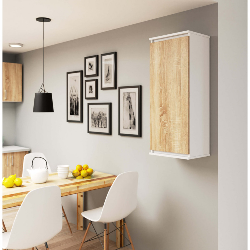 Scurta descriere Dulapul suspendat CLP alb/sonoma imbina eleganta moderna cu functionalitatea practica, fiind ideal pentru living, dormitor sau birou. Combinatia intre nuanta naturala stejar sonoma si finisajul alb mat creeaza un contrast armonios si atemporal. Cele trei rafturi interioare ofera spatiu amplu pentru depozitarea articolelor utile sau decorative, iar constructia din PAL laminat asigura durabilitate si rezistenta in utilizarea zilnica.