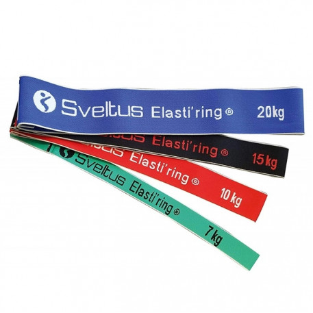 Set 4 benzi elastice Elasti’ring ideale pentru exercitii dinamice de incalzire, intarire musculara, Yoga, Pilates si reabilitare. Sunt potrivite pentru toate nivelurile de fitness, antreneaza toate partile corpului. Sunt folosite in special pentru fese si coapse. Benzile elastice pot fi utilizate simultan, in functie de intensitatea antrenamentului.Culori diferite in functie de rezistenta: verde, rosu, negru, albastruFiecare banda are forta de rezistenta diferita: 7 kg, 10 kg, 15 kg si 20 kg. Lungime: 35 cmToleranta: +/- 10%Pot fi folosite si la Aqua Gym.