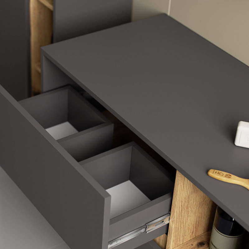 Scurta descriere: Dulapul de baie suspendat VAMI W90 combina designul modern cu functionalitatea inteligenta. Construit din PAL laminat rezistent la umiditate, ofera durabilitate si aspect elegant datorita finisajului mat in nuante de gri grafit si stejar artisan. Cele doua sertare spatioase si rafturile deschise asigura spatiu generos pentru depozitarea produselor de igiena, a prosoapelor si a accesoriilor. Marginile sunt protejate cu okleina ABS, oferind rezistenta suplimentara la uzura si umezeala. Modelul este conceput special pentru montaj sub lavoar, cu spatiu dedicat pentru sifon si instalatii.