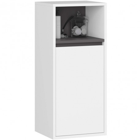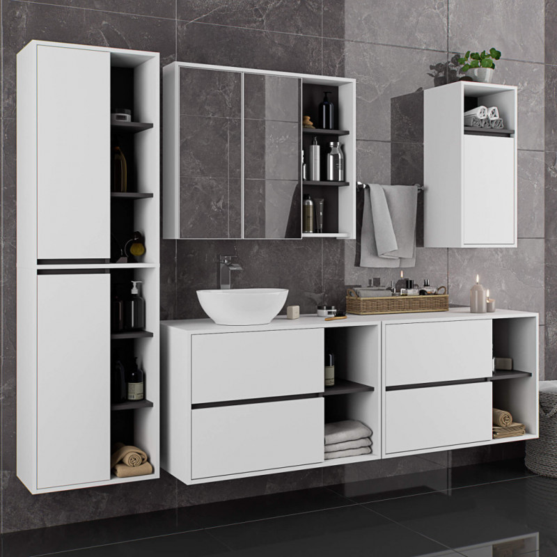 Scurta descriere: Etajera suspendata de baie VAMI W35 este o solutie moderna si practica pentru spatii mici. Cu un design ingust si elegant, ofera spatiu optim pentru depozitarea produselor de igiena si a accesoriilor de baie. Fabricata din PAL laminat de 16 mm, este rezistenta la umiditate si uzura. Finisajul mat in combinatie alb/gri grafit adauga un accent contemporan in orice incapere. Marginile sunt protejate cu okleina ABS, care asigura rezistenta in timp si protejeaza mobilierul de umezeala si deteriorari.