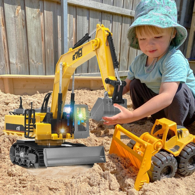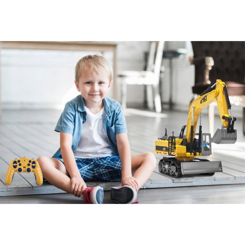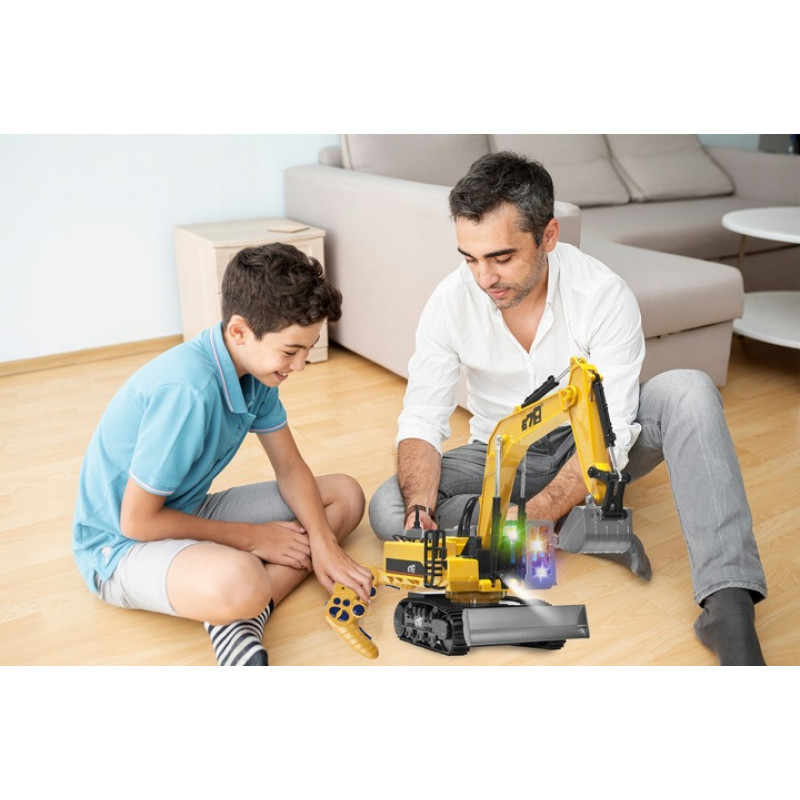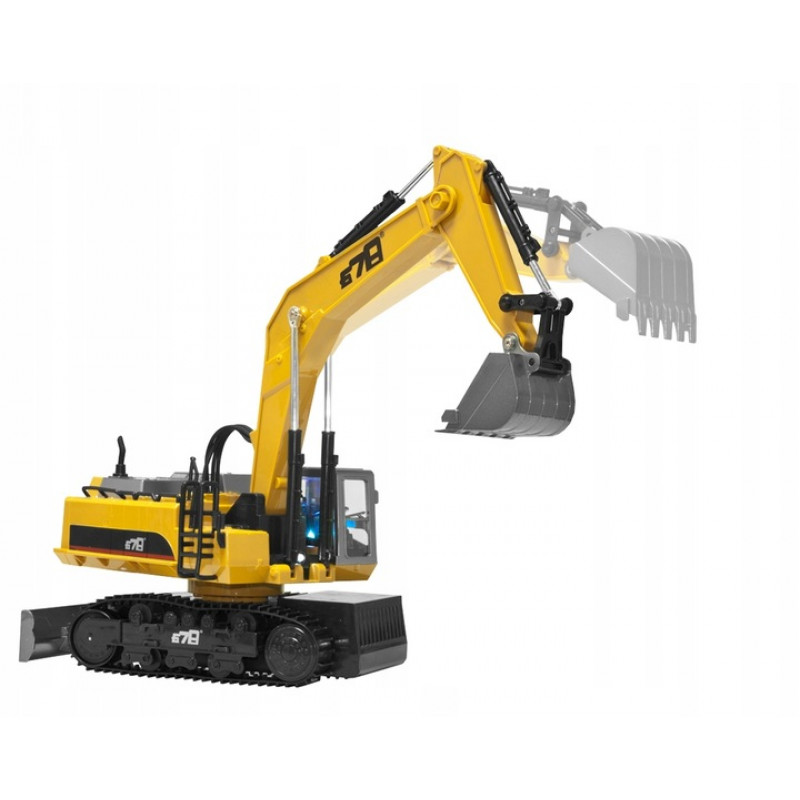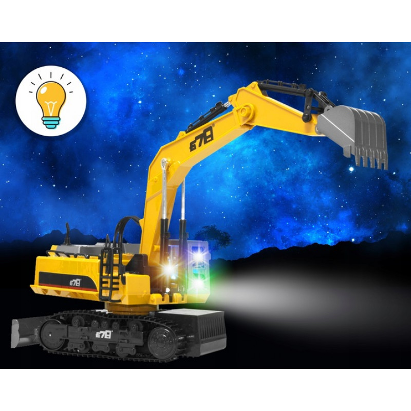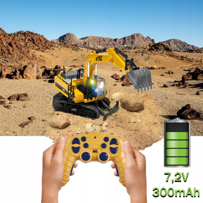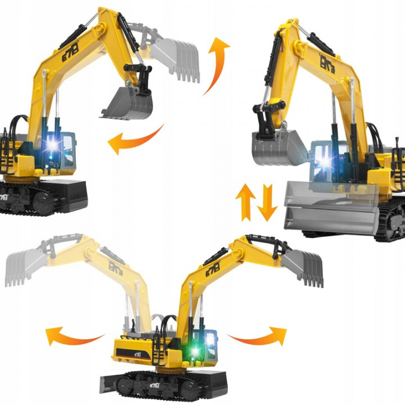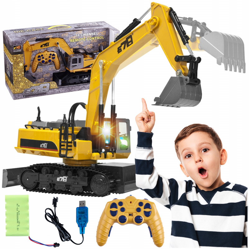 Jucaria este conceputa pentru copii cu varsta peste 3 ani. O jucarie grozava pentru fiecare mic pasionat de bricolaj - un excavator mare, controlat de la distanta si alimentat cu baterii. Datorita acesteia, copilul tau se va simti ca un adevarat constructor. Jucaria face aceleasi miscari ca un excavator adevarat, este foarte realista si incurajeaza jocul. Face o impresie grozava prin dimensiunea, atentia la detalii si modul in care functioneaza. In plus, are iluminare de fundal LED eficienta. Aduce multa bucurie nu numai celor mai tineri. Excavatorul se poate misca inainte si inapoi, se poate intoarce la dreapta si la stanga si se poate roti in jurul propriei axe. Bratul excavatorului si cupa sunt, de asemenea, mobile si pot apuca obiecte, de exemplu blocuri, care se afla pe podea si apoi le pot transporta in alt loc. Excavatorul poate sapa si razui, de asemenea, diverse obiecte. Cabina este, de asemenea, rotita in jurul propriei axe (manual). Ilumineaza eficient in timpul lucrului. Toate functiile pot fi controlate cu ajutorul telecomenzii. Senilele sunt din cauciuc, astfel incat faciliteaza deplasarea pe suprafete alunecoase (panouri, gresie), iar excavatorul in sine este alimentat de o baterie, ceea ce inseamna ca nu este nevoie sa cumparati baterii pentru a-l alimenta. Bateria poate fi incarcata cu incarcatorul USB inclus in set. Totul este ambalat in ambalaje colorate si originale - grozav ca cadou! Un excavator este o idee grozava de cadou. Mare, impresionant, bine realizat, controlat de la distanta si realist. Ambalaj cool, colorat, iluminare de fundal cu LED, elemente metalice si puterea bateriei sunt