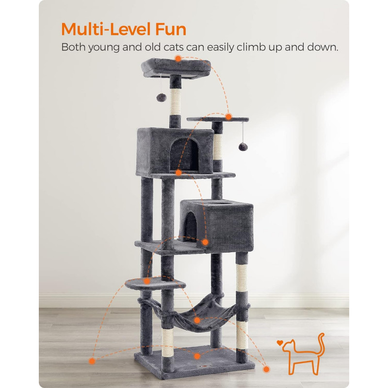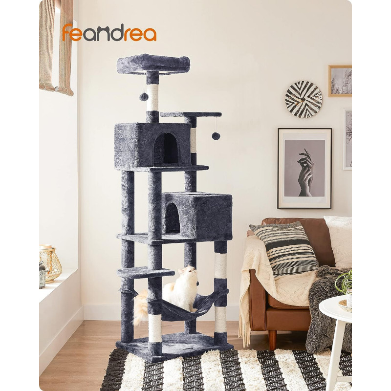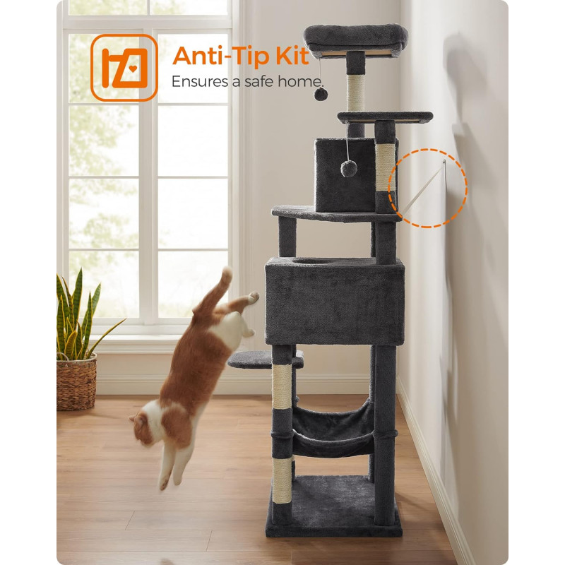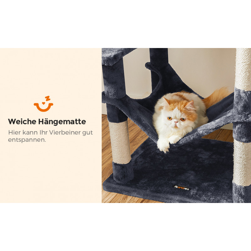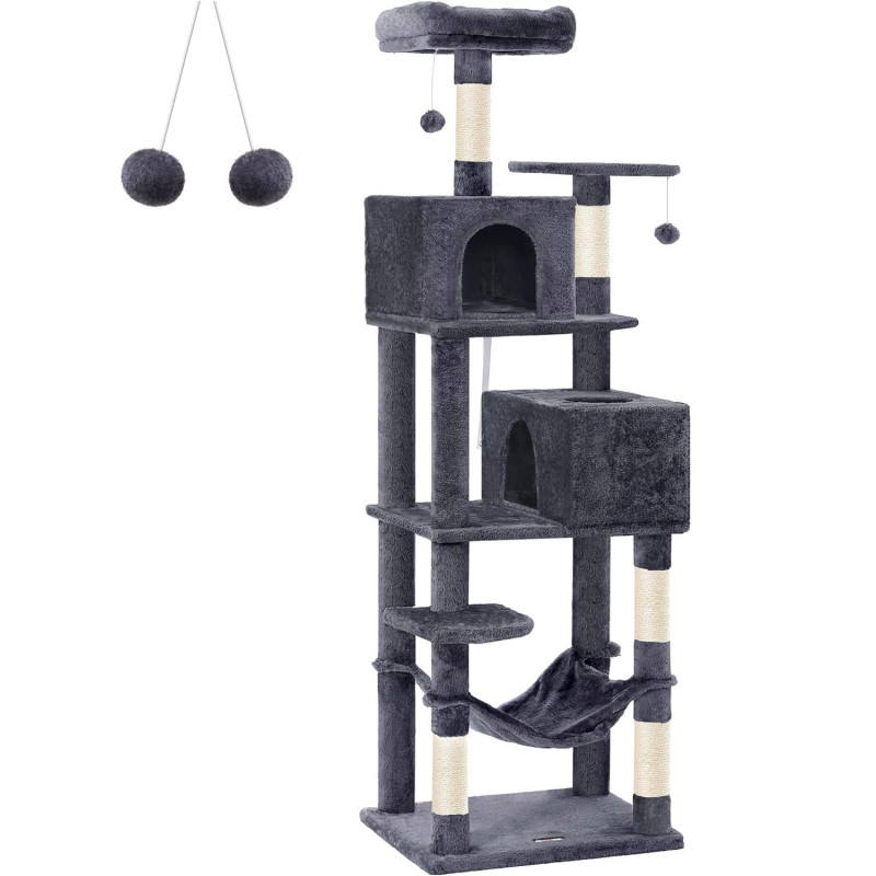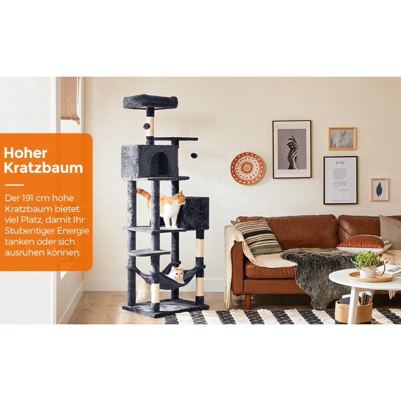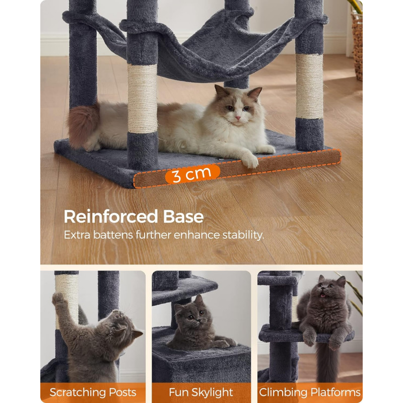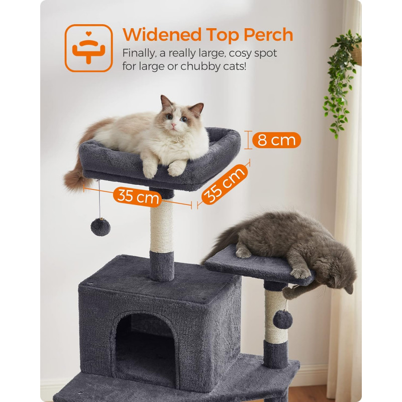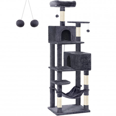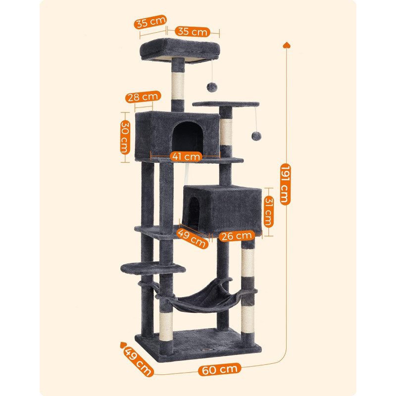 Instructiuni Arborele de pisici are toate calitatile de care aveti nevoie pentru a va incanta pisica.Loc de joaca pe mai multe niveluri: Designul pe mai multe niveluri faciliteaza urcarea si coborarea si il ghideaza pe micul tau prieten blanos pe un traseu plin de distracti.Doua bile de plus, distractie dubla: Treziti instinctul de vanatoare al pisicii dvs. cu ajutorul bilelor de plus suspendate. Daca pisicile tale devin putin prea entuziasmate de bilutele de pe acest turn pentru pisici, mai aveti doua de rezerva (si daca nu esti un fan al zgomotului, rezervele vin fara clopotel).Fabricat cu placi aglomerate de calitate, intarit cu sipci in partea inferioara, asigurat de un kit anti-rasturnare, acoperit cu plus durabil si prevazut cu sisal rezistent la uzura, acest arbore pentru pisici va va aduce cu siguranta bucurie de durata.