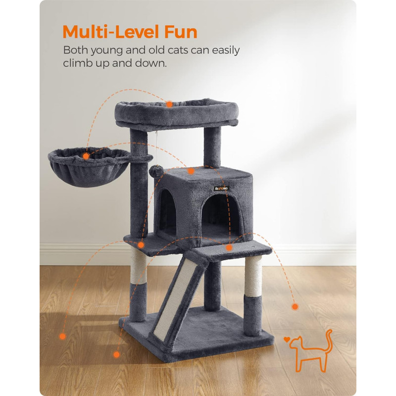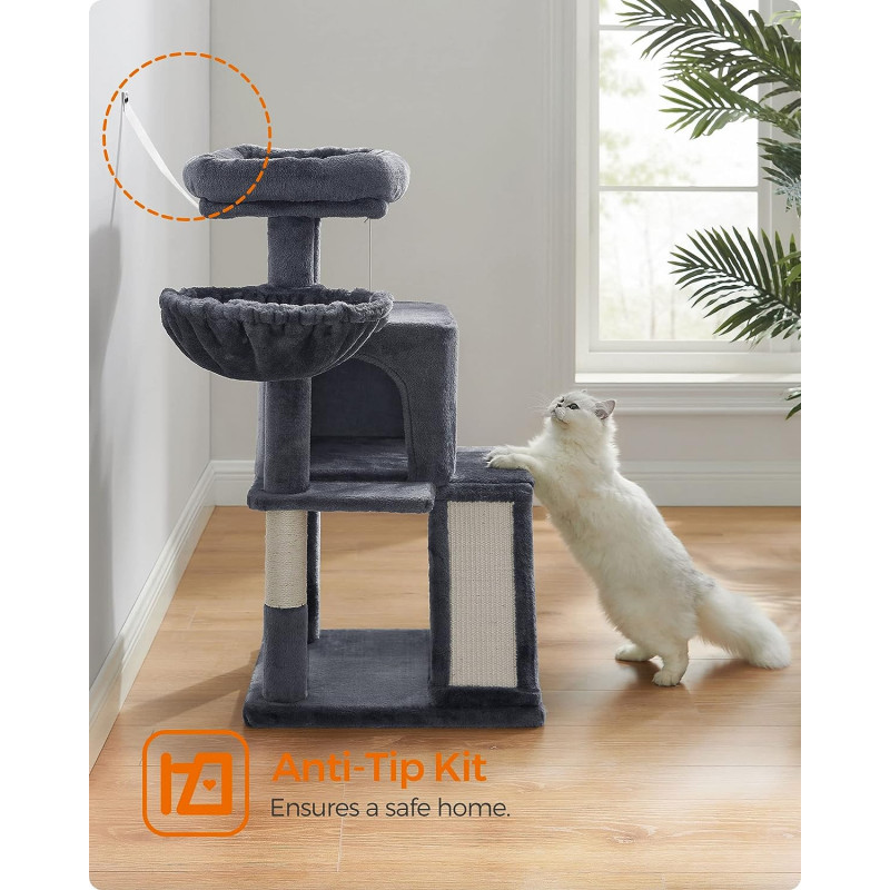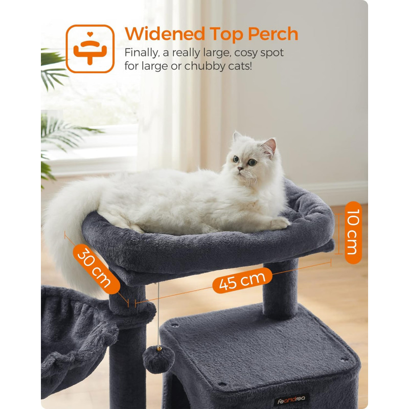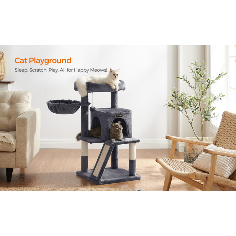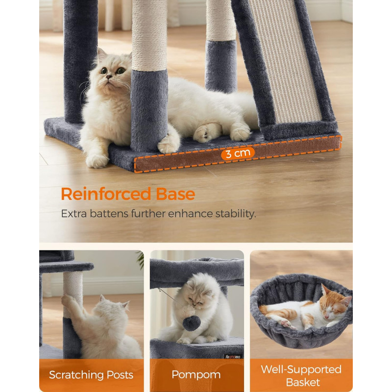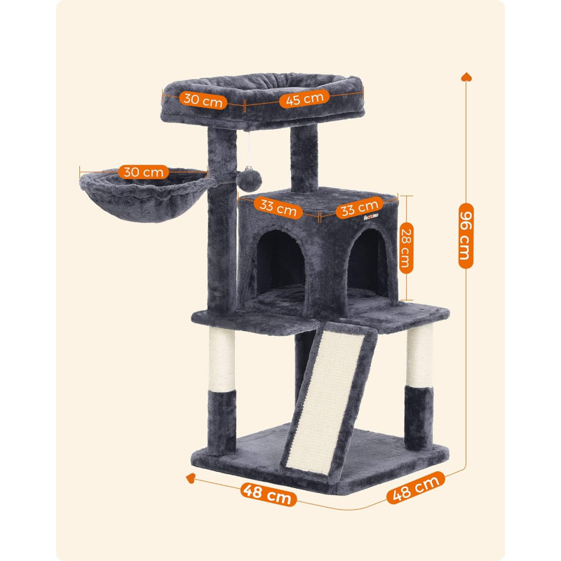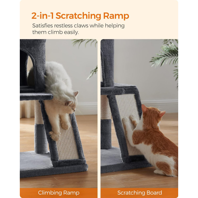 Instructiuni Despre acest articol Arborele de pisici are toate calitatile de care aveti nevoie pentru a va incanta pisica.Cu o platforma de 45 x 30 cm, pisicile mai mari sau dolofane pot in sfarsit sa se intinda si sa se relaxeze confortabil.Rampa de zgariat 2 in 1: Cu o placa de zgariat si o scara intr-una, acest ansamblu nu numai ca le permite pisicilor sa zgarie dupa pofta inimii, fara a va strica canapeaua, dar ii ajuta pe pisoi, pisici in varsta si chiar si pisicile cu probleme de mobilitate sa urce si sa coboare cu usurinta.Pestera pentru pisici cu 2 usi: Proiectata cu 2 usi, aceasta pestera pentru pisici permite felinei dvs. sa intre si sa iasa cu usurinta sau sa mearga la cosul pufos.Materiale de calitate, bucurie durabila: Fabricat cu placi aglomerate de calitate, asigurat de un kit anti-rasturnare, acoperit cu plus durabil si prevazut cu sisal rezistent la uzura, acest arbore pentru pisici va va aduce cu siguranta bucurie de durata.Un pompon de rezerva: Daca pisicile tale devin putin prea entuziasmate de pomponul de pe acest turn pentru pisici, mai exista unul de rezerva (si daca nu sunteti un fan al zgomotului, cel de rezerva vine fara clopotel).