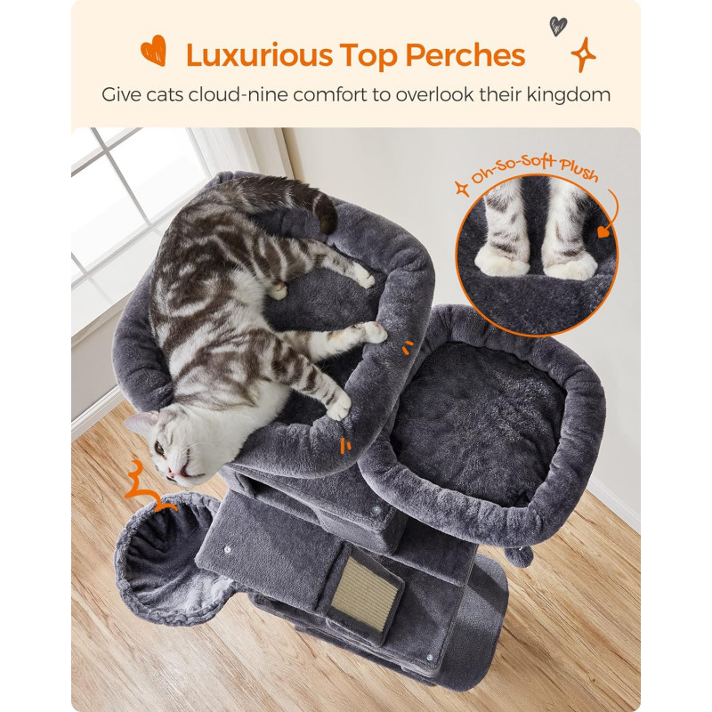 Accesorii amuzante pentru mai multa distractie Pe langa locurile de odihna confortabile din zonele superioare ale copacului pentru pisici, in zona inferioara exista un loc de joaca captivant, cu o placa de zgariat inclinata.Daca trebuie sa inlocuiti un pompon sau nu sunteti un fan al zgomotelor de clopotei, acest ansamblu vine cu un pompon de rezerva fara clopotel. Acesta este cu siguranta momentul potrivit pentru a oferi pisicii tale iubite un loc ideal de dezvoltare, joaca si odihna.