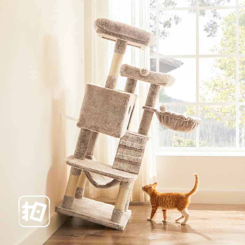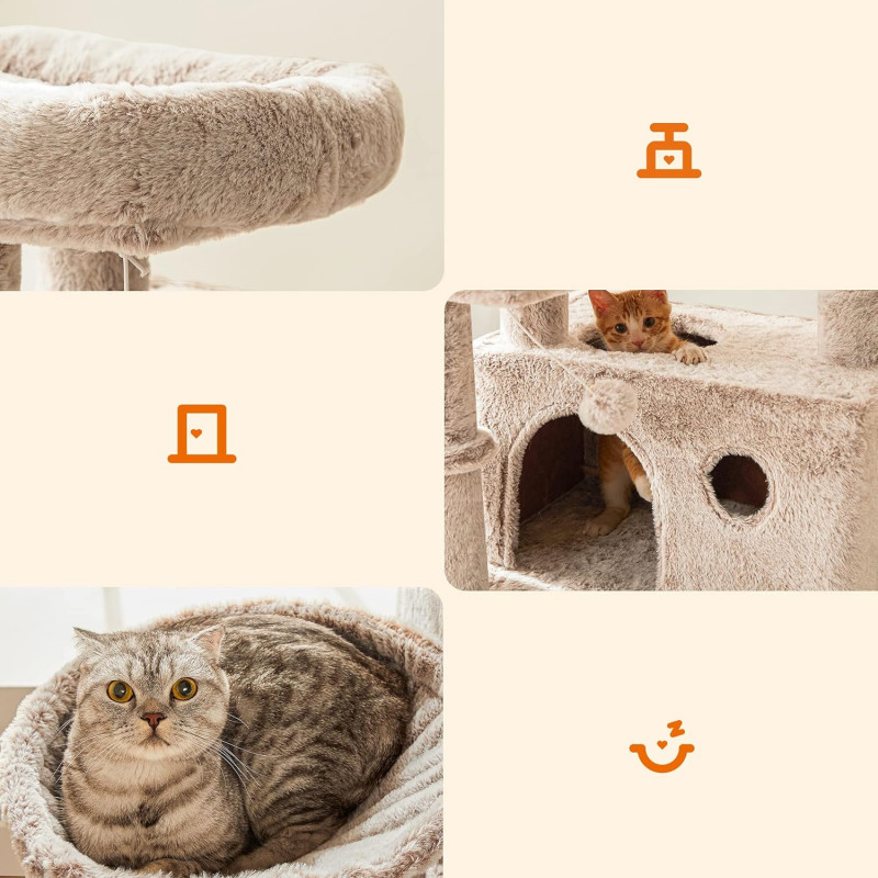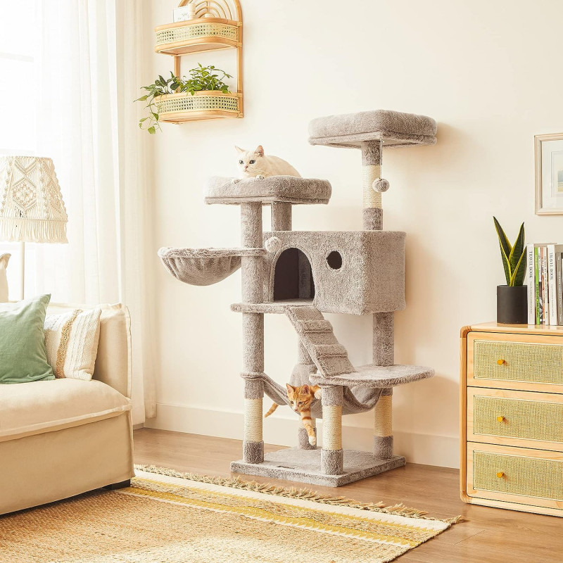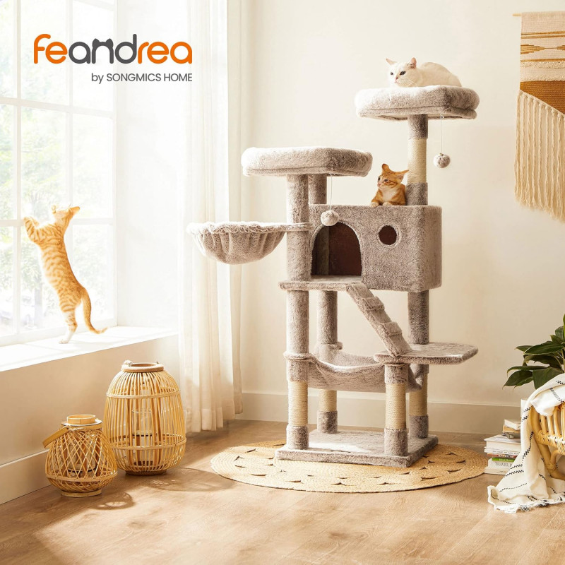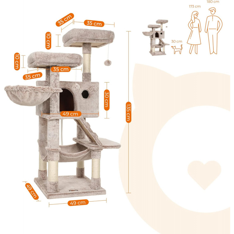 Greutate: 15 kg Despre acest articol Acest ansamblu de joaca pentru pisici inalt de 135 cm este acoperit cu plus de 500 g/m² (mai moale, mai dens si mai pufos) pentru ca pisica dvs. sa se simta confortabil aici.Pestera de plus cu o dimensiune de 49 x 30 x 30 cm ii ofera prietenului dumneavoastra cu patru picioare un loc confortabil unde se poate relaxa in liniste.Cu o fundatie intarita si un dispozitiv anti-inclinare, acest ansamblu pentru pisici are un plus de stabilitate chiar si atunci cand pisicile energice sau dolofane se distreaza.Ce primesti: O scara pentru o urcare usoara, stalpi de sisal pentru ascutirea ghearelor, un loc de intins confortabil pentru relaxare, un hamac pentru somn si doua platforme bine captusite cu margini ridicate. Distractie placuta!Faceti-va pisicile fericite: Rasfatati-va pisicile cu acest copac pentru pisici, astfel incat sa nu se simta singure cand sunteti plecat.