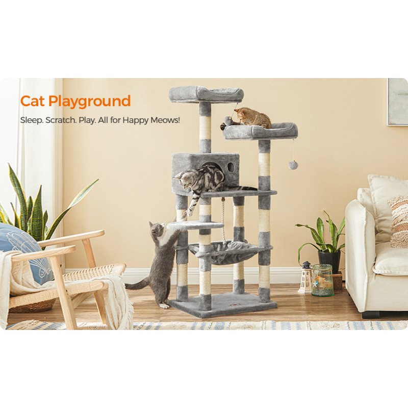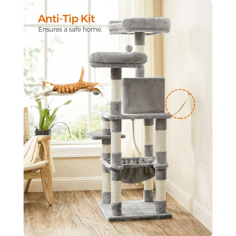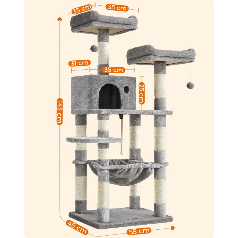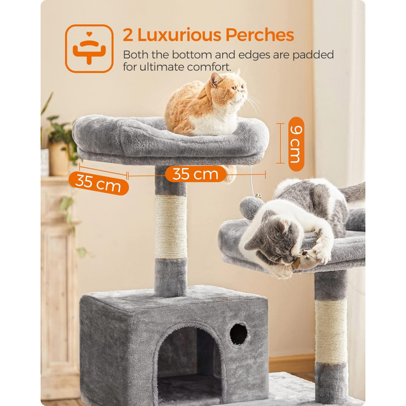 Totul la vedere: pe cele 2 platforme de vizionare dragalase cu captuseala groasa, pisicile tale au o vedere perfecta asupra a ceea ce se intampla in apartamentul tau.Elementele individuale ale ansamblului pentru pisici sunt aranjate pe diferite niveluri, astfel incat chiar si pisoii mici sau pisicile mai in varsta sa poata urca cu usurinta.Plus gros, sisal rezistent la zgarieturi, placi robuste din lemn prelucrat - materialele acestui turn pentru pisici vor impresiona chiar si pe cea mai pretentioasa felina.