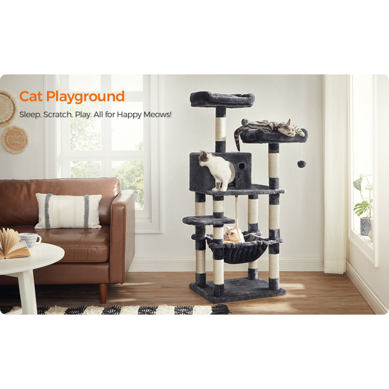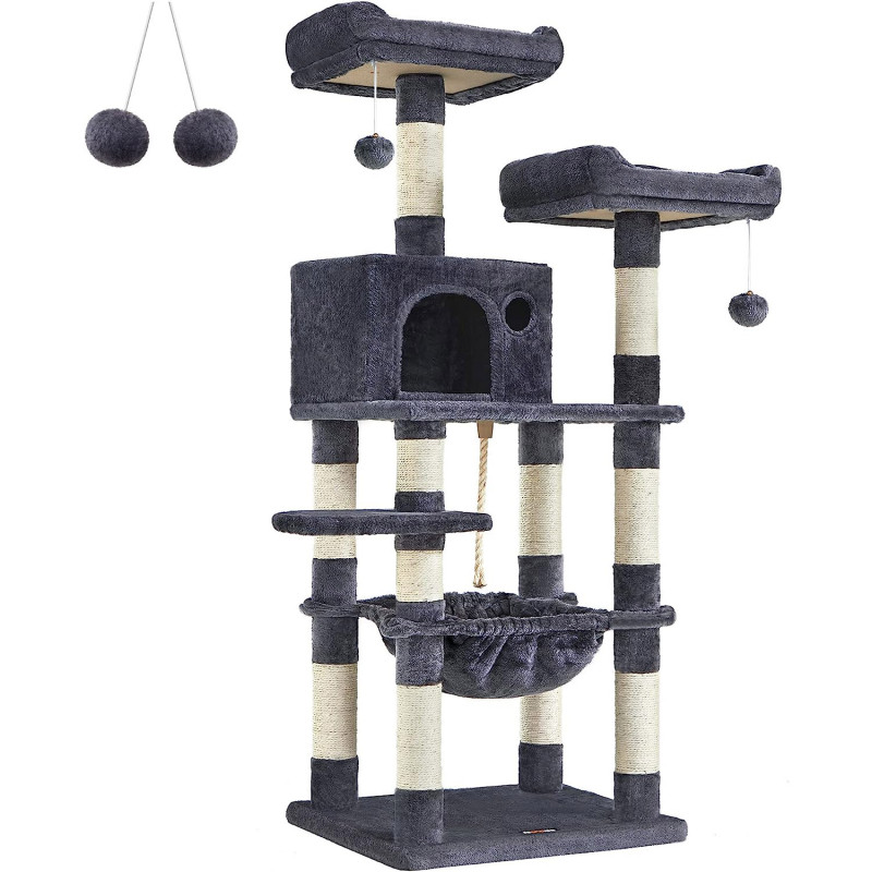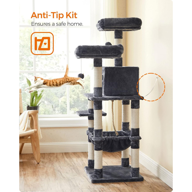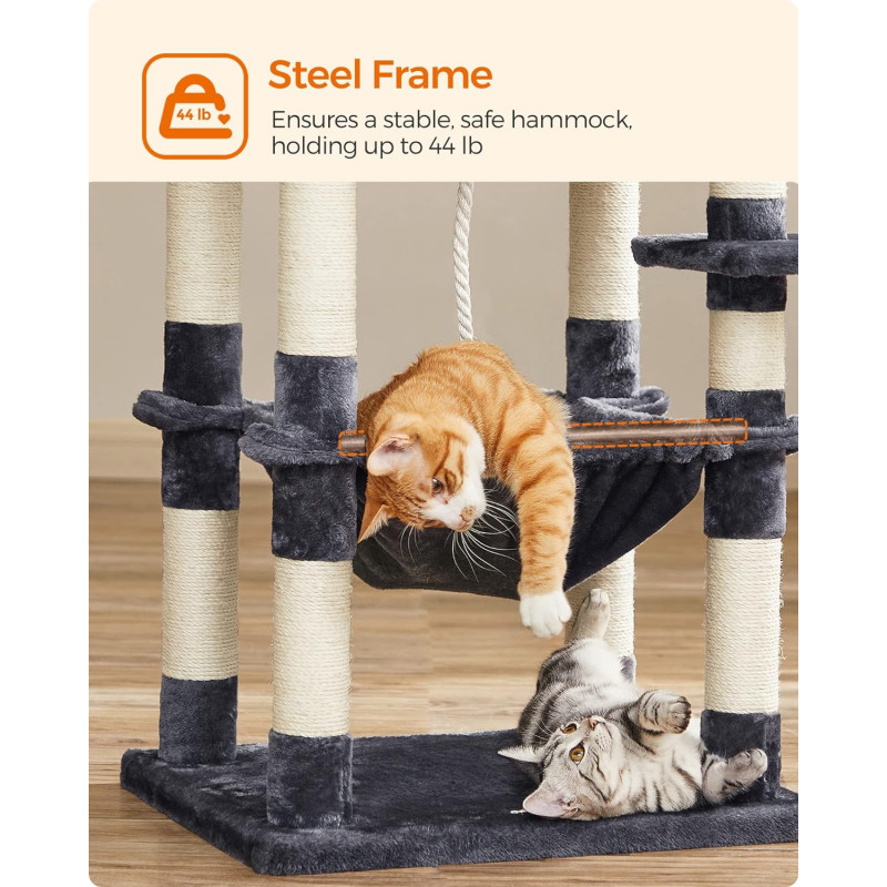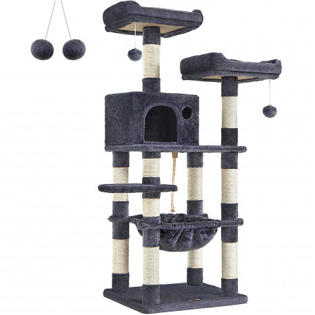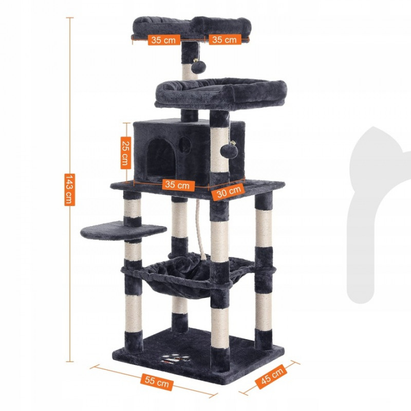 Instructiuni Despre acest articol Cele 2 puncte din varf ale acestui arbore de pisici, inclusiv marginile inaltate, sunt umplute pana la refuz cu captuseala moale, astfel incat pisicile tale sa se poata odihni in fericire toata ziua.Hamac, mai stabil ca niciodata: Sustinut de un cadru robust din otel fixat pe 4 stalpi puternici, acest hamac mare si pufos poate sustine pana la 15 kg - un loc premium pentru prietenii dolofani din blana.Un pompon de rezerva: daca pisicile tale devin putin prea entuziasmate de pomponul de pe acest turn pentru pisici, mai aveti altul de rezerva (si daca nu esti un fan al zgomotului, rezerva vine fara clopotel).Materiale de calitate, bucurie durabila: Fabricat cu placi aglomerate de calitate, intarit cu sipci in partea inferioara, asigurat de un kit anti-rasturnare, acoperit cu plus durabil si prevazut cu sisal rezistent la uzura, acest arbore pentru pisici va va aduce cu siguranta bucurie de durata.Prietenos pentru tineri si batrani: acest ansamblu pentru pisici este proiectat pe mai multe niveluri, asemanator unei scari, astfel incat chiar si pisoii tineri si pisicile in varsta pot urca sau cobori cu usurinta.