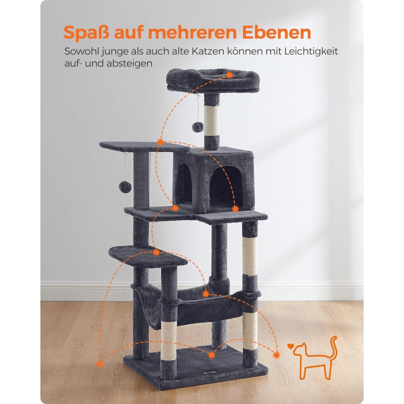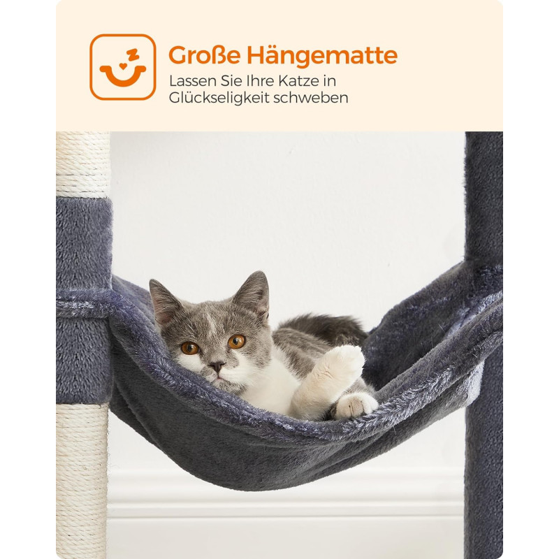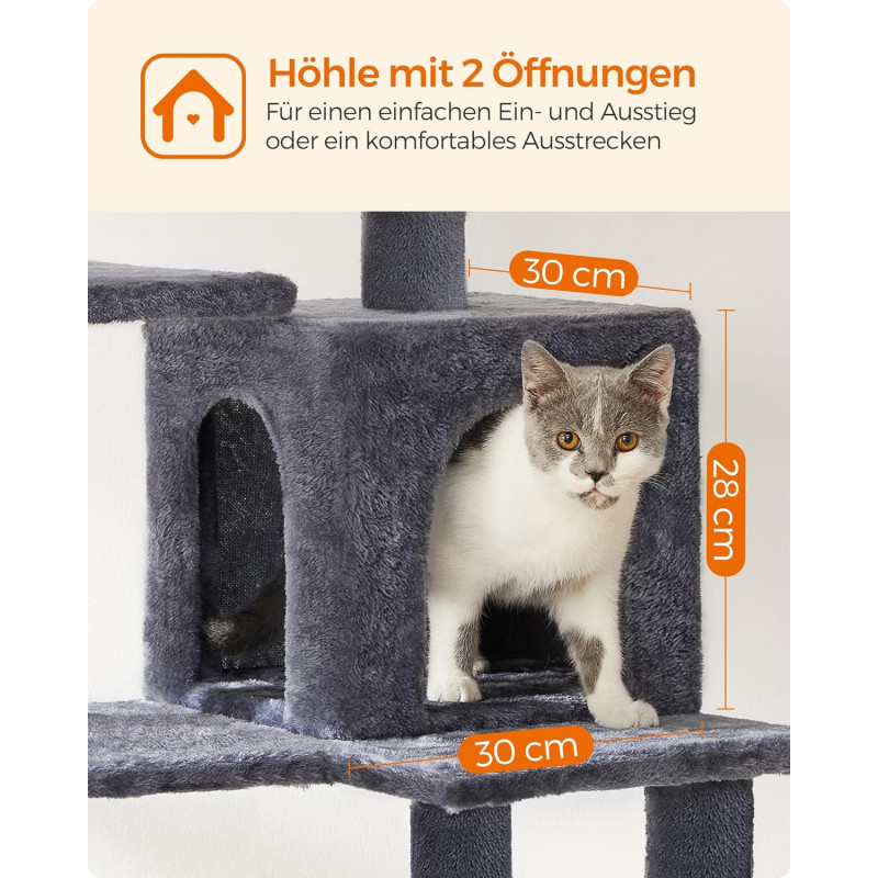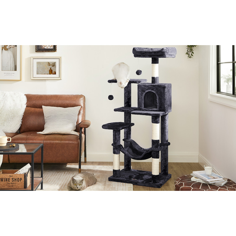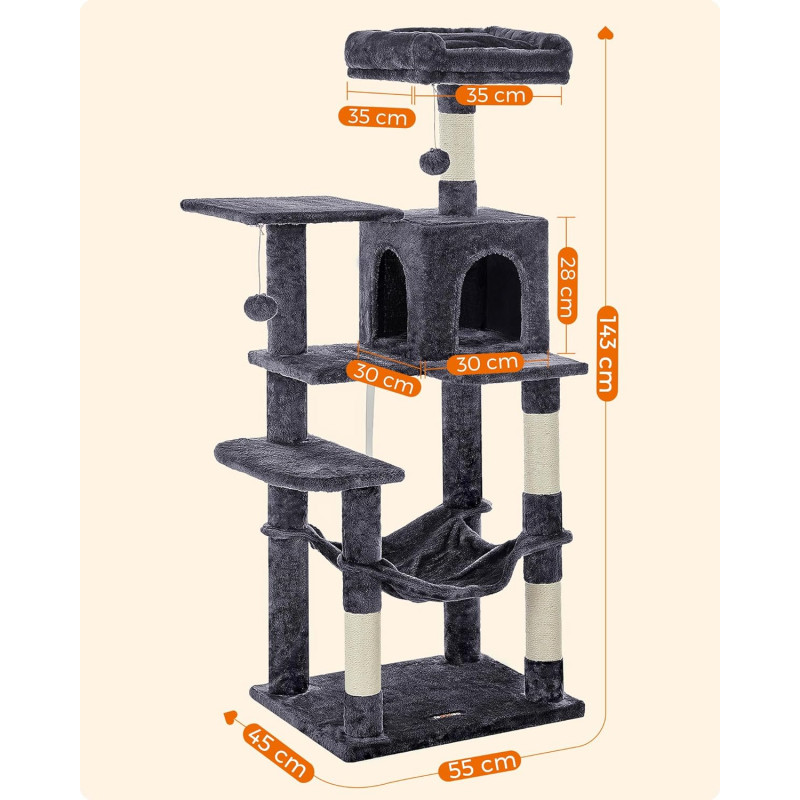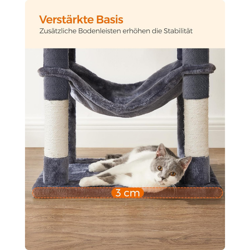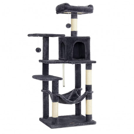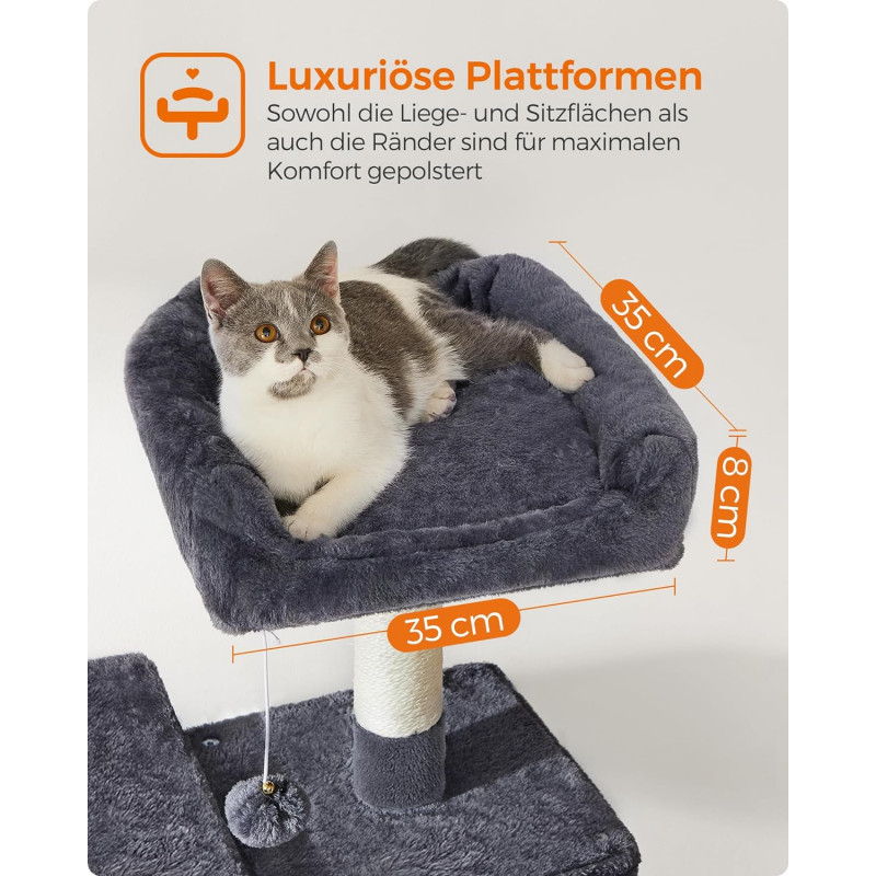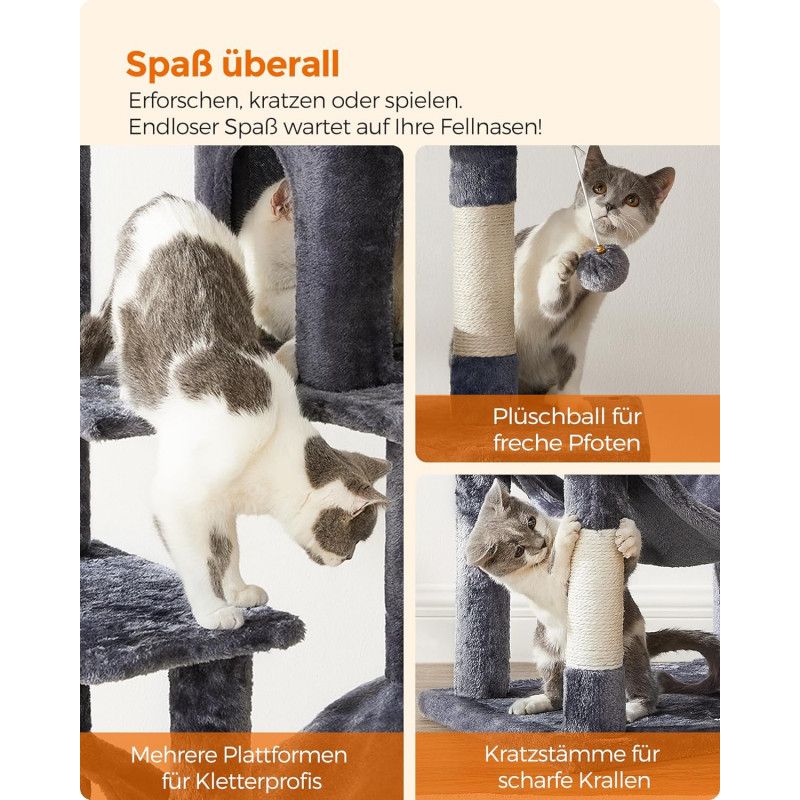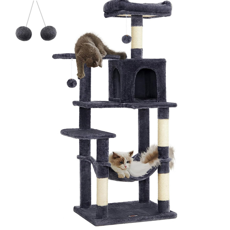 Greutate: 13 kg Despre acest articol Cu 2 platforme si o pestera confortabila pentru pisici, acest ansamblu ofera mai multe locuri confortabile pentru ca prietenii dvs. blanosi sa se relaxeze.Usor de asamblat: Cu o structura simpla, suruburi universale si cheie Allen inclusa, acest copac pentru pisici poate fi montat de o singura persoana.2 mingi de plus cu clopotei incurajeaza pisica de casa sa se relaxeze. Daca pisicile tale devin putin prea entuziasmate de pomponul de pe acest turn pentru pisici, mai aveti doua de rezerva (si daca nu esti un fan al zgomotului, rezervele vin fara clopotel).Datorita aranjamentului in forma de scari si a platformelor de catarare, atat pisicutele, cat si pisicile in varsta pot urca si cobori cu usurinta.Usor de curatat: Par, murdarie si firimituri... nu va faceti griji. Sunt usor de curatat cu o rola de scame sau cu un aspirator.