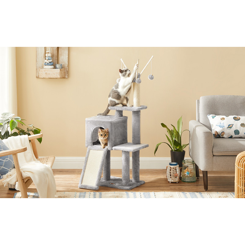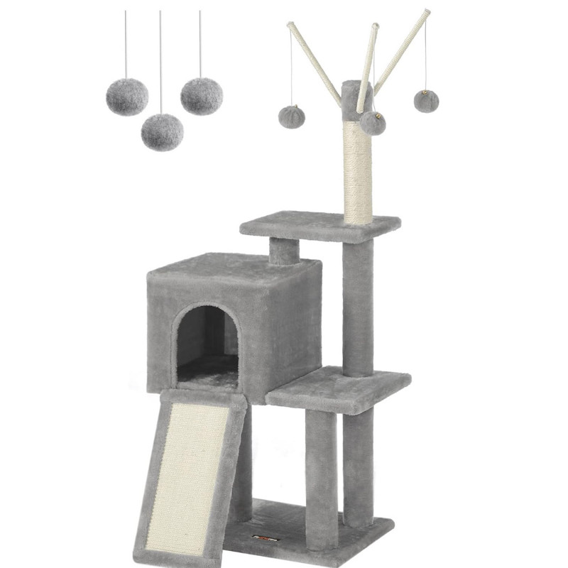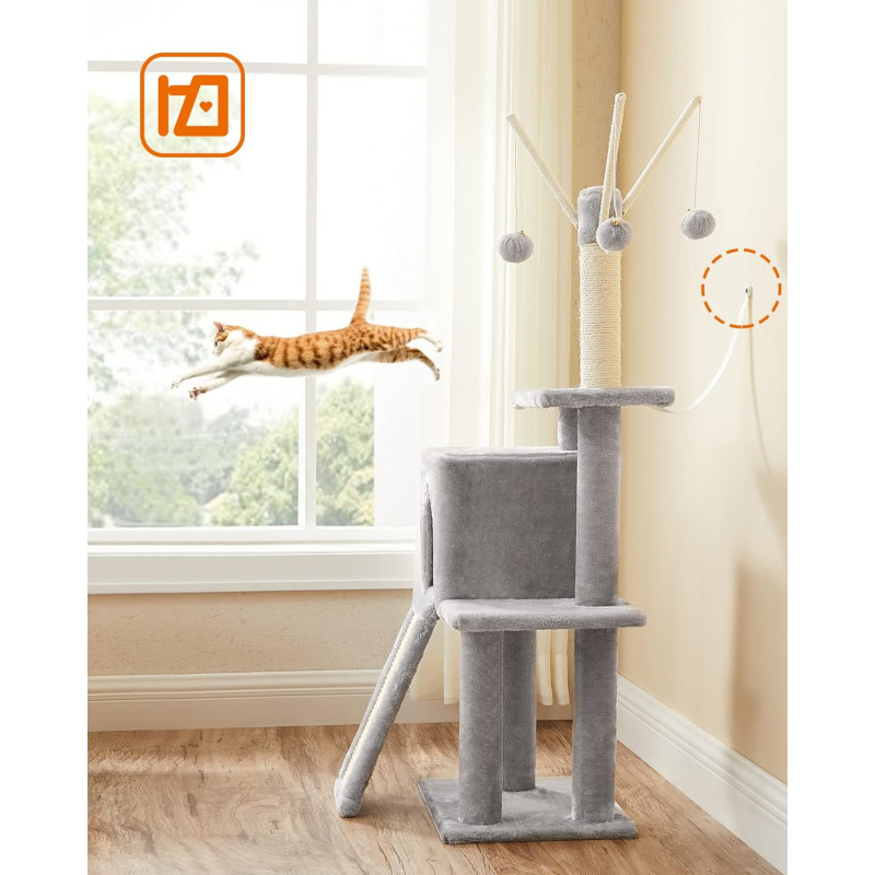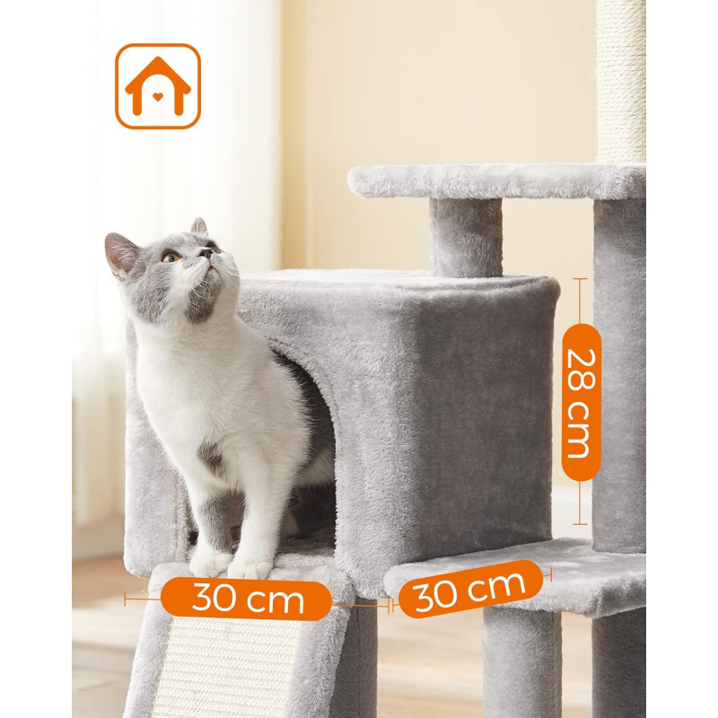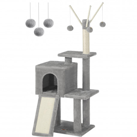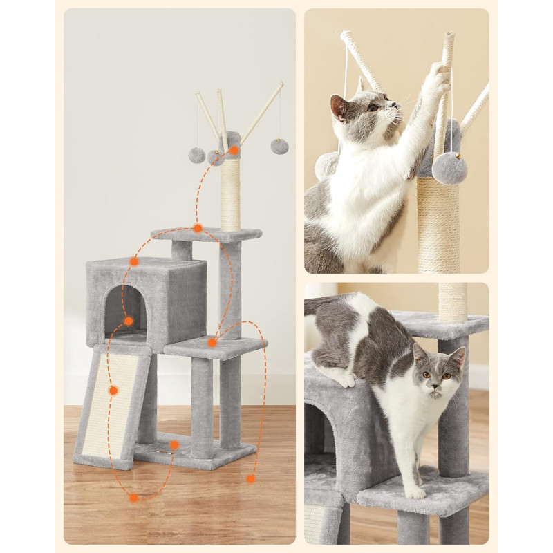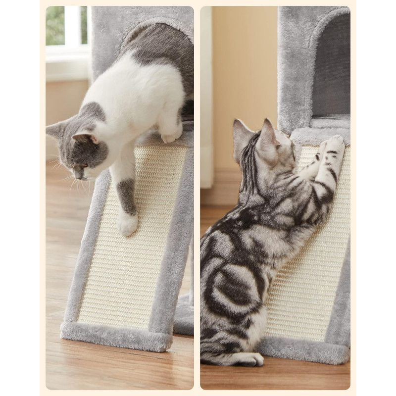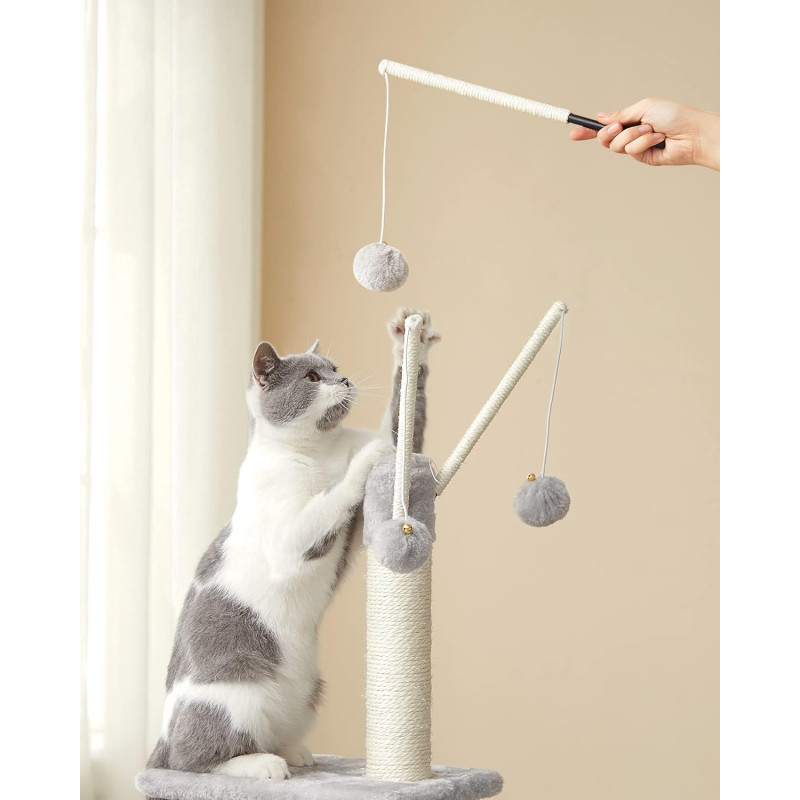 Betisoare cu pompon detasabile: Pe varful arborelui mic pentru pisici sunt 3 betisoare cu pompon - distractie fara sfarsit pentru pisicile carora le place sa se joace! In plus, toate cele 3 bete cu pompon sunt detasabile, astfel incat sa va puteti juca impreuna cu pisicile pentru mai multa distractie.Rampa de zgariat 2 in 1: Cu o placa de zgariat si o scara intr-una, acest dispozitiv de zgariat nu numai ca le permite pisicilor sa zgarie dupa pofta inimii, fara a va strica canapeaua, dar ii ajuta pe pisoi sa se relaxeze.Sigur, stabil: Sisal natural pentru siguranta, PAL robust si o baza ranforsata pentru stabilitate si un kit anti-rasturnare pentru securitate - acest turn de joaca pentru pisici ofera un loc de joaca sigur pentru 2 pisici (max. 7 kg fiecare)Pestera confortabila a pisicilor: Datorita spatiului inchis si plusului pufos, aceasta pestera pentru pisici ofera un loc linistit si confortabil pentru pisica ta.Distractie pe mai multe niveluri: Cu mai multe niveluri si zone diferite pentru a se juca si a se relaxa, fiecare pisica se poate urca si cobori cu usurinta si isi poate gasi locul preferat, fie ea tanara sau batrana.
