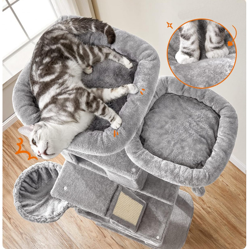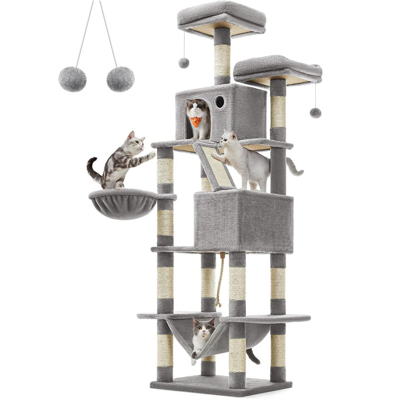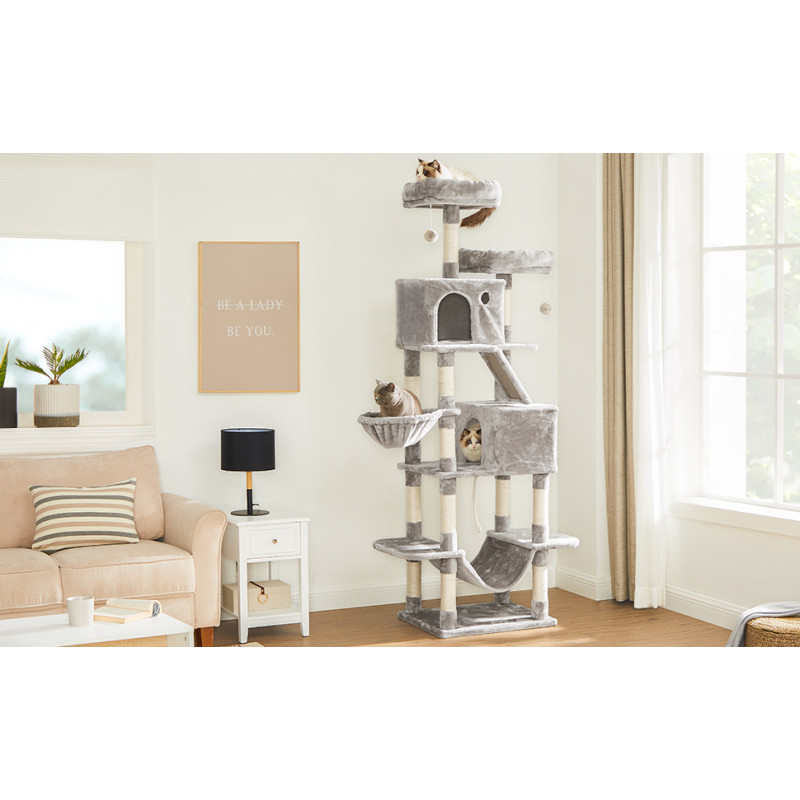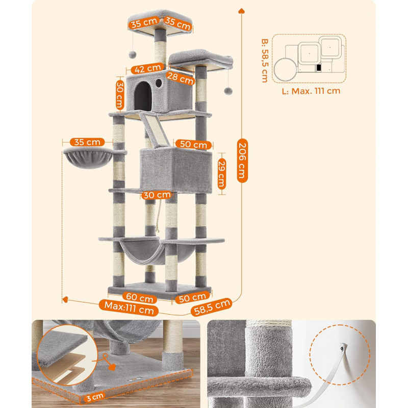 Dimensiuni: 60 x 50 x 206 cm (L x l x i) Despre acest articol 206 cm inaltime, distractie nesfarsita. 5 trepte: Distante scurte de 30-40 cm intre trepte. Acest ansamblu pentru pisici faciliteaza urcarea si coborarea si este perfect pentru pisicile carora le place sa se catere.Loc de joaca: Doua platforme bine captusite, doua vizuini de plus, un cos pufos, doua mingi de plus si un hamac. Fiecare pisica isi va gasi un loc preferat in acest ansamblu pentru pisici pe mai multe niveluri, perfect pentru familiile cu mai multe pisici. Datorita placii aglomerate de calitate, a bazei mari cu benzi intarite si a protectiei impotriva inclinarii, acest loc de joaca solid este potrivit pentru 6 pisici mari (7 kg fiecare).Usor de asamblat: Datorita structurii simple, a