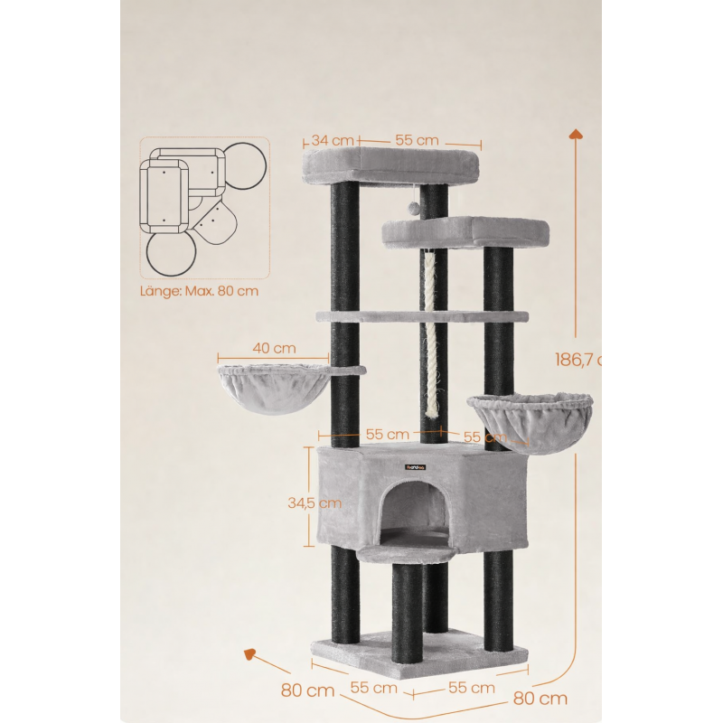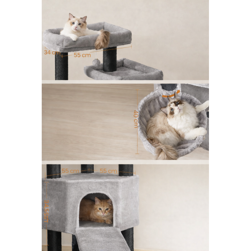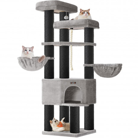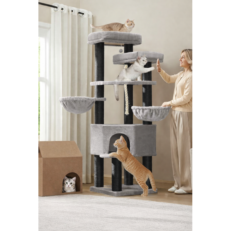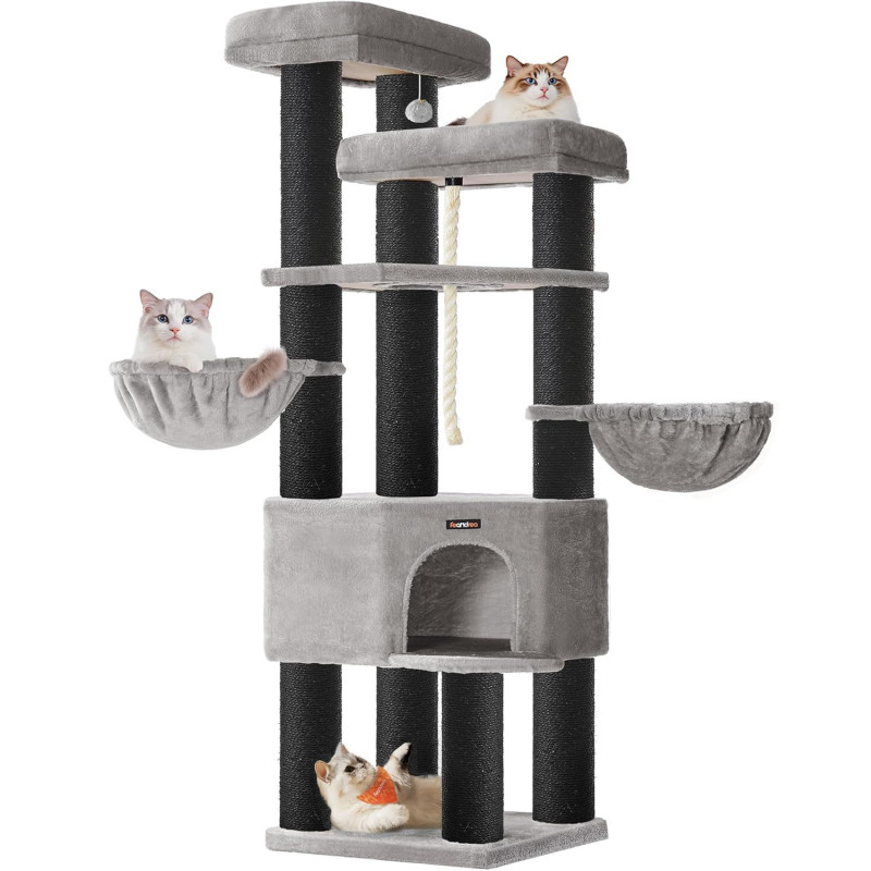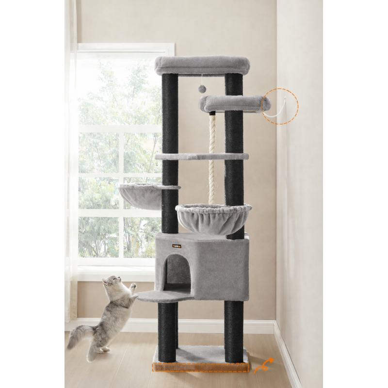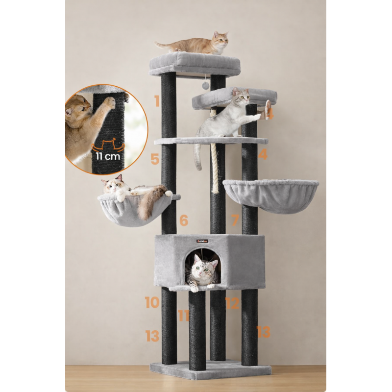 Scurta descriere Ansamblul de joaca FEANDREA XXL este conceput pentru pisici de talie mare sau pentru gospodarii cu mai multe feline. Cu o structura solida, 13 stalpi grosi imbracati in sisal si 5 niveluri pentru catarat si relaxare, ofera un spatiu complet pentru joaca, odihna si ascutirea ghearelor, protejand in acelasi timp mobilierul.