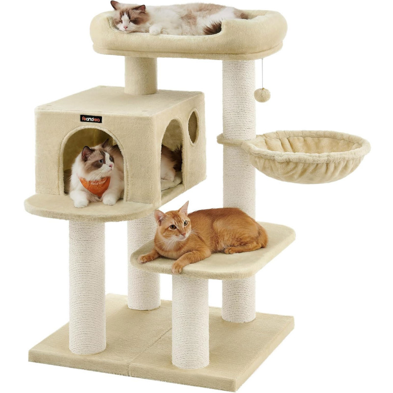 Stalpi foarte grosi (diametru 11,3 cm); complet inveliti in sisal Platforma de vizionare spatioasa si pestera; cu covoare moi Pat adanc si confortabil (diametru 40 cm)Mai multa stabilitate datorita unei placi de baza cu doua straturi, precum si a protectiei la inclinare Elemente de baza mobile pentru alinierea flexibila a stalpului de zgariat Dimensiunile produsului 70 x 60 x 112 cm; 26,6 kg Culoare bej Pentru pisici mari Un culcus mare de sus, pestera pentru pisici si hamac - acest copac pentru pisici este potrivit si pentru pisici mari sau dolofane, chiar si pentru Maine Coons si Ragdolls! Si ele merita o pestera spatioasa pentru pisici pentru a se intinde si relaxa Stabil si robust Cu stalpi foarte grosi (11 cm) si o baza mare intarita, acest copac pentru pisici cu mai multe niveluri ofera un loc de joaca stabil si sigur pentru pisicile dvs. pe care sa se zbenguie si sa se joace. Fara oscilatii, fara griji! 6 locuri de zgariat Pisicilor le place sa zgarie. Posturile de zgariat infasurate in franghie de sisal de pe fiecare nivel ii permit pisicii dvs. sa isi desfaca ghearele dupa bunul plac in acest turn pentru pisici. Mobila dvs. va va multumi!