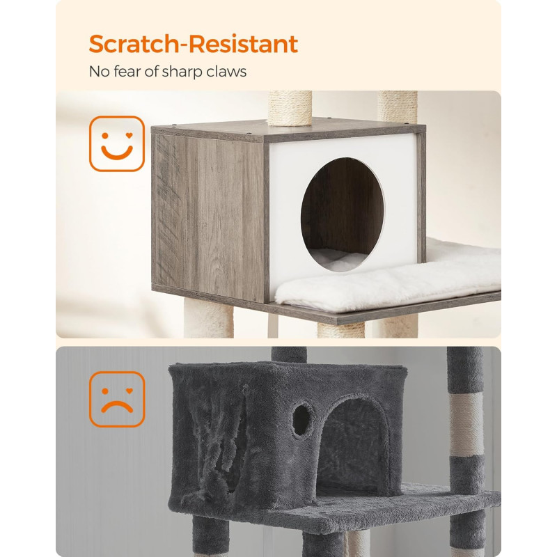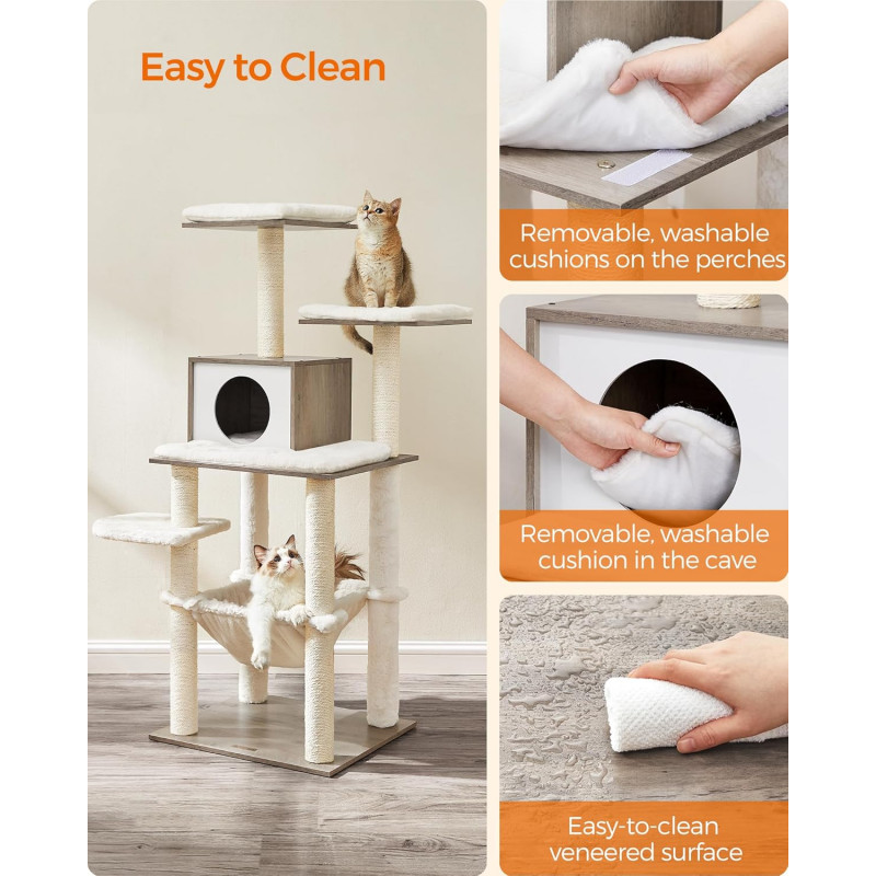 In atelierele de creatie Feandrea, sar in jur doua pisicute dragute, care examineaza personal toate posturile de scarpinat si ofera feedback-ul lor animalic. Astfel, designerii de la Feandrea afla pe propria piele sau cu prima laba, daca produsele indeplinesc cerintele purtatorilor de mustati rasfatate. Punctele forte ale acestui post de zgariat la o privire: Cu suprafata rustica, copacul pentru pisici se potriveste bine cu decorul casei dvs. Plusul de 500 g/m² ofera o suprafata pufoasa si confortabila. 2 platforme in partea de sus pentru observare. 1 pestera mare pufoasa pentru un pui de somn. 1 sezlong pufos pentru relaxare. Stalpi din sisal pentru ascutirea ghearelor. Pernele detasabile sunt usor de curatat