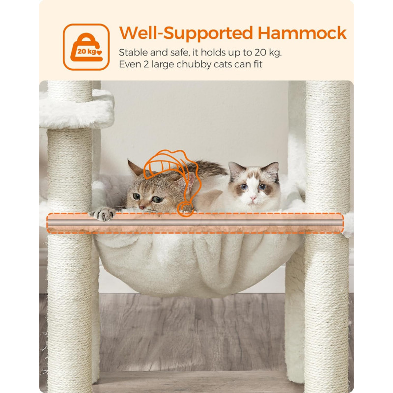 Stabila si sigura: cu un hamac cu cadru metalic, tampoane antiderapante si o protectie impotriva inclinarii, aceasta casa pentru pisici cu o capacitate de incarcare statica maxima de 40 kg este stabila si sigura pentru pana la 4 pisici mari (fiecare max. 7 kg) pentru urcare si coborare
