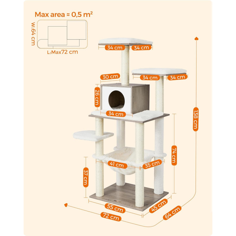 Usor de curatat: pe suprafata placata nu se acumuleaza blana si este usor de curatat cu o carpa. Pernele de pe platforma si din pestera sunt detasabile si lavabile, astfel incat sa puteti pastra cu usurinta copacul pentru pisici curat Confort la cel mai inalt nivel: perna si hamacul sunt fabricate din plus de 500 g/m² - chiar mai moale si mai pufos decat plusul conventional, astfel incat prietenii dvs. blanosi se pot juca, relaxa si atipi in cel mai inalt confort Durabil pentru distractie de lunga durata: Acest stalp de zgariat pisici din PAL este rezistent la zgarieturi si durabil - cu siguranta va insoti nasurile micilor dvs. pentru o lunga perioada de timp si va oferi o distractie de durata