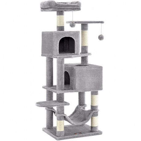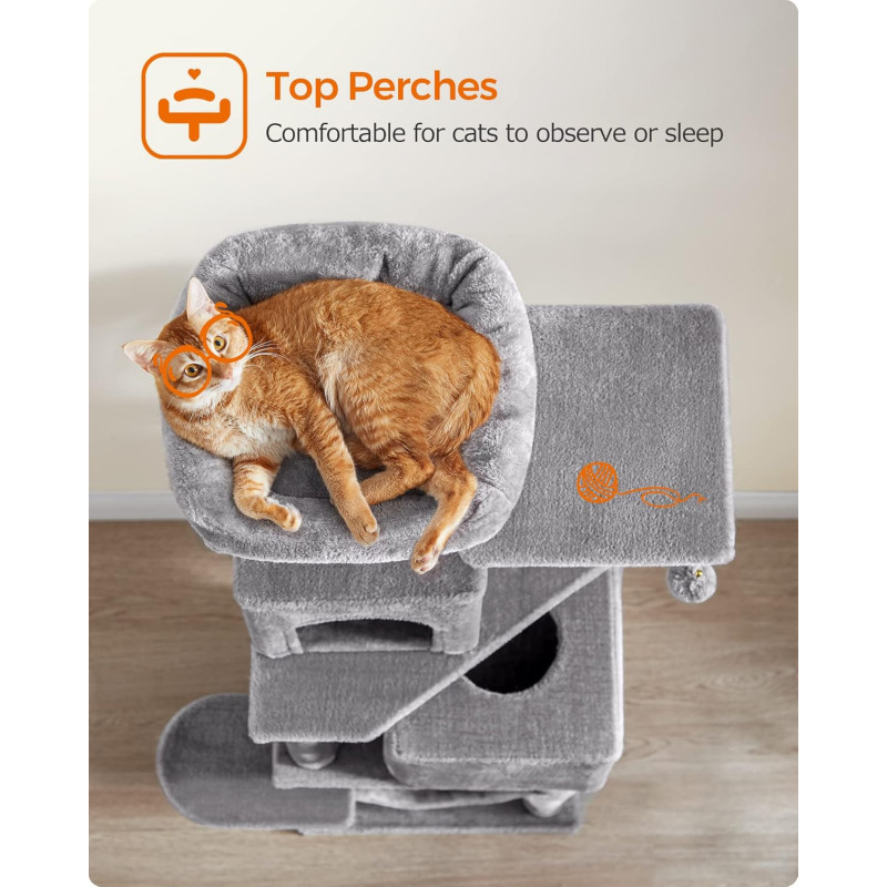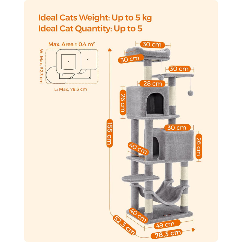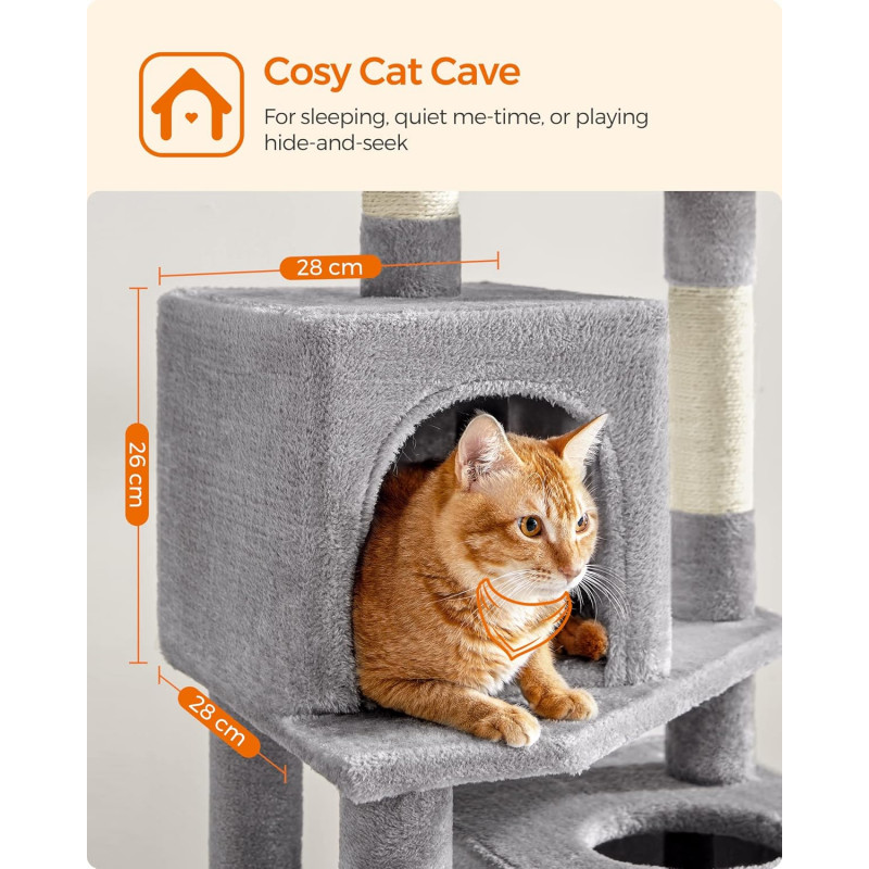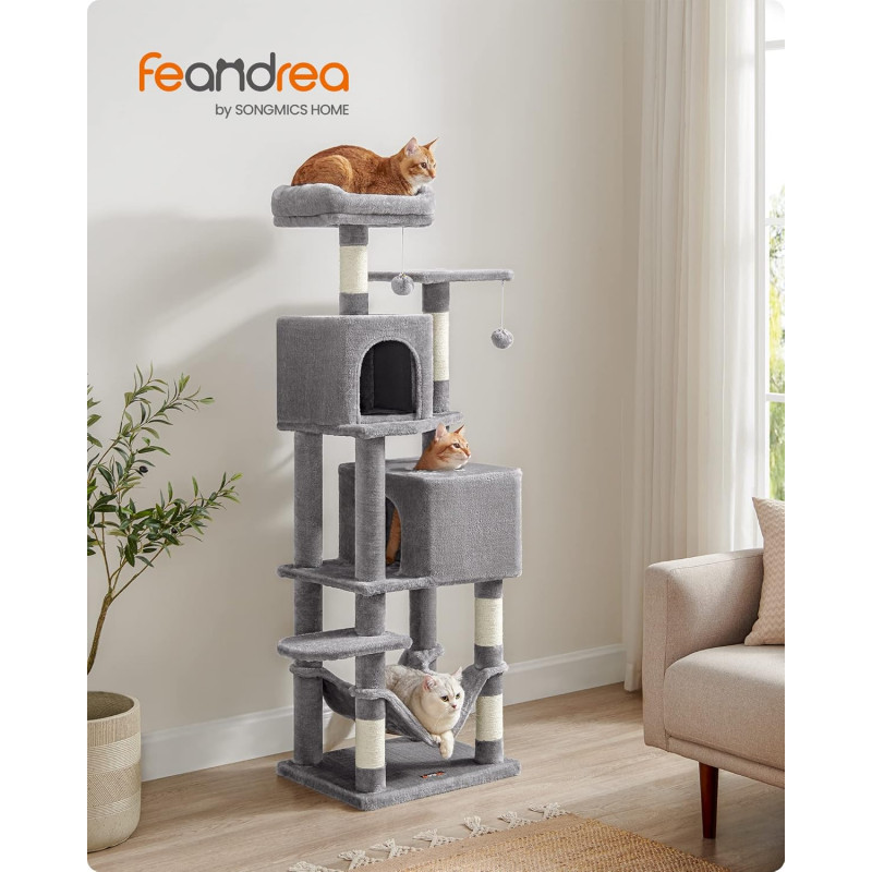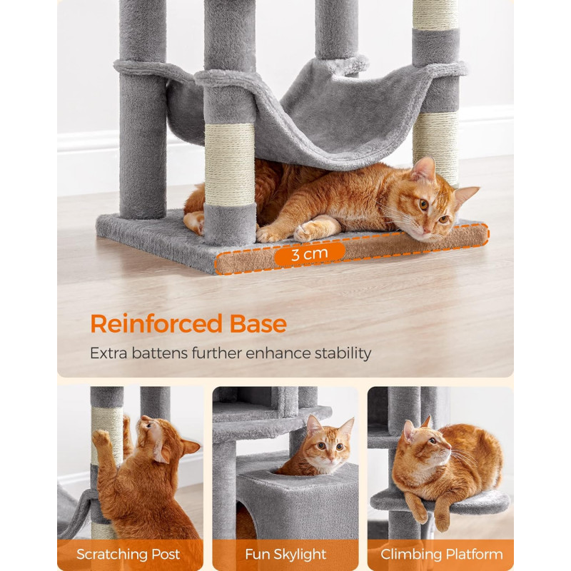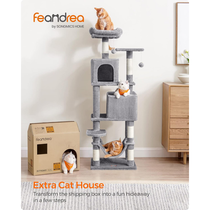 Feandrea: Daca prietenul dvs. cu blana incepe sa mestece sau sa manance pompomul sau banda elastica, va rugam sa le indepartati si sa nu le tineti la indemana prietenului dvs. pentru o vreme.Daca pestera pentru pisici este zgariata si deteriorata de labele obraznice, va rugam sa o reparati sau sa o inlocuiti inainte de a continua utilizarea pentru a evita riscul de ranire.Deoarece pisicilor le place sa sara si sa se joace, va rugam sa atasati turnul pentru pisici la perete cu kitul anti-inclinare inclus pentru utilizare in siguranta. 2 culcusuri, 2 pesteri Acest copac pentru pisici se mandreste cu doua culcusuri luxoase de sus si doua pesteri spatioase pentru pisici, oferind mai multe locuri confortabile din care pisicile sa se relaxeze si sa observe - perfect pentru gospodariile cu mai multe pisici Loc de joaca multi-level Proiectat cu mai multe niveluri, acest turn pentru pisici face usor pentru pisici sa urce si sa exploreze spatiul vertical, satisfacandu-le instinctele naturale si nevoile de activitate Asamblare usoara Cu suruburi universale si o structura simpla, acest condo pentru pisici poate fi asamblat rapid de o singura persoana folosind cheia Allen inclusa 2 pompoane, distractie dubla 2 pompoane suspendate cu clopotei va incurajeaza micii vanatori sa se intinda, sa bata si sa loveasca pentru o distractie fara sfarsit. In plus, 2 pompoane de rezerva fara clopotei sunt incluse ca o optiune silentioasa Puternic si sigur Construit cu o structura puternica, acest turn de joaca pentru pisici rezista testului timpului, permitand pana la 4 pisici (max. 7 kg fiecare) sa urce si sa se joace cu incredere. Este inclus un kit anti-basculare pentru a crea o casa sigura pentru pisicile si familia dvs.