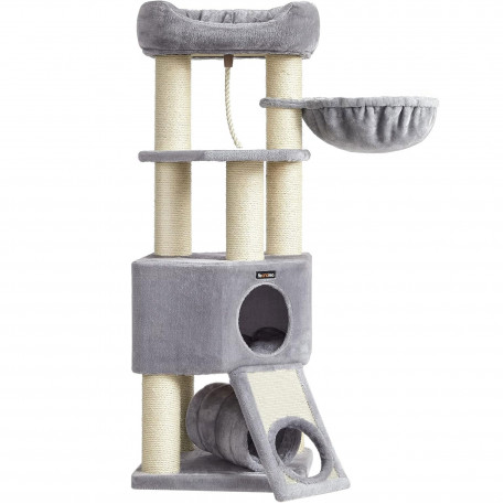 Precautii: Va rugam sa plasati acest arbore pentru pisici pe o suprafata plana si impotriva peretelui. Din motive de siguranta, este foarte recomandabil sa il fixati pe perete cu dispozitivul anti-basculare inclus. Va rugam sa nu utilizati acest arbore pentru pisici intr-un mediu umed. Este interzis copiilor sa se urce pe produs si sa se joace cu el. Spatiu XXL Acest copac pentru pisici este echipat cu o platforma mare de 50 x 50 cm, o cusca mare de 50 x 50 x 30 cm si un hamac XXL de 40 cm. Este potrivit in special pentru pisici mari Robust si stabil Cu o baza mare de 50 x 50 cm, stalpi grosi cu un diametru de 11,5 cm si bare de armare, acest turn de joaca este stabil chiar si atunci cand pisicile dvs. topaie. Kitul de inclinare il fixeaza la perete pentru si mai multa siguranta Pentru maxim 5 pisici Acest mobilier pentru pisici suporta pana la 83 kg in total. Cu mai multe niveluri, pisicile dvs. pot servi casa pe platforma, pot trage un pui de somn in hamac sau pot zgaria pe stalpii din sisal si pe stalpul de zgariat Usor de curatat si asamblat Capacul platformei de observatie este detasabil si lavabil. Toate suruburile sunt identice, chiar nu este nevoie sa le diferentiati. Asamblarea se face de catre o singura persoana folosind cheia Allen furnizata Loc de joaca, distractie fara sfarsit Cu placa de zgariat cu o gaura, franghie sisal agatata, hamac si platforma, acest copac pentru pisici ofera distractie fara sfarsit pentru prietenii dvs. felini