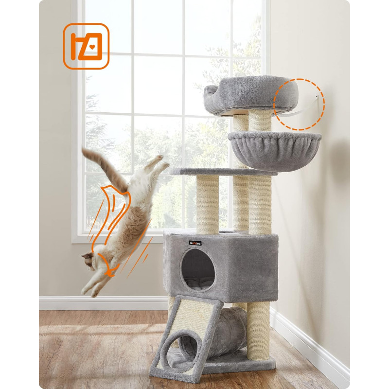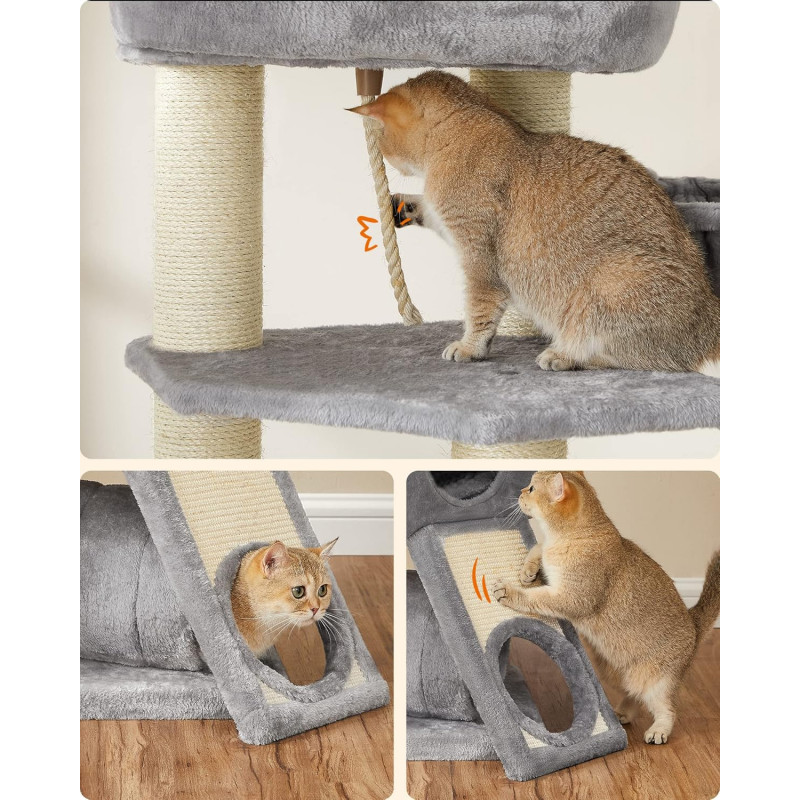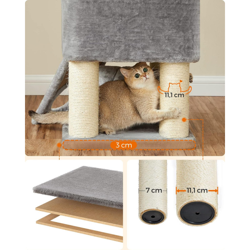 O multime de spatiu: Dimensiunea totala este de 50 x 50 x 141 cm, cu o platforma mare, un hamac larg si o nisa spatioasa Baza de 50 x 50 cm, stalpii grosi cu diametrul de 11,5 cm, materialele de calitate si kitul anti-basculare inclus asigura o stabilitate perfecta. Potrivit pentru pisoi si pisici in varsta: Nivelurile si tabla de zgariat le faciliteaza urcarea si coborarea.