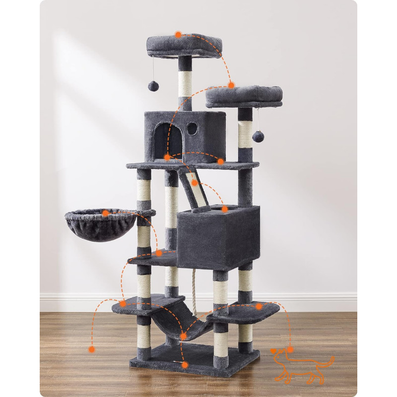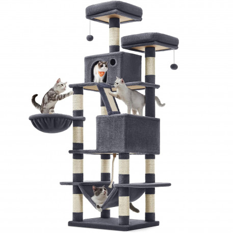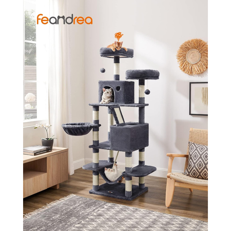 instructiuni Note FEANDREA: Daca pisica dvs. incepe sa mestece sau sa manance pompomul sau banda elastica, va rugam sa scoateti jucaria si sa nu o tineti la indemana pisicii dvs. pentru o vreme. Daca pestera pentru pisici este zgariata si deteriorata, va rugam sa o reparati sau sa o inlocuiti inainte de utilizarea ulterioara pentru a minimiza riscul de ranire a pisicii dumneavoastra. Deoarece pisicilor le place sa sara si sa se joace, va rugam sa atasati produsul la perete cu protectia de inclinare inclusa. 168 cm inaltime, distractie fara sfarsit la catarat. 5 trepte. Distante scurte de 25-30 cm intre trepte. Acest copac pentru pisici faciliteaza urcarea si coborarea si este perfect pentru pisicile carora le place sa se catere si sa ajunga sus. Loc de joaca all-in-one: 2 platforme bine captusite, 2 vizuini dragalase, 1 cos pufos, 2 mingi de plus si 1 hamac. Fiecare pisica va gasi un loc preferat pe acest copac pentru pisici cu mai multe niveluri, perfect pentru casele cu mai multe pisici. Robust, sigur si protejat: Datorita placilor aglomerate de calitate, unei baze mari cu benzi de baza ranforsate si unei protectii impotriva inclinarii, acest stalp de zgariat robust este potrivit pentru pana la 6 pisici mari (5 kg fiecare). 13 posturi de zgariat si 1 rampa de zgariat din franghie sisal: Cu suprafete de zgariat pe fiecare nivel, pisicile dvs. pot zgaria dupa pofta inimii, astfel incat, in cele din urma, sa scape canapeaua dvs.! In plus, rampa de zgariat ajuta pisoii si pisicile mai in varsta sa urce