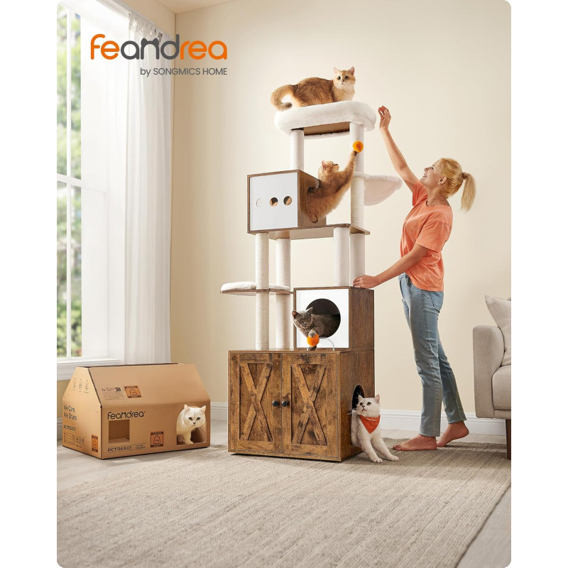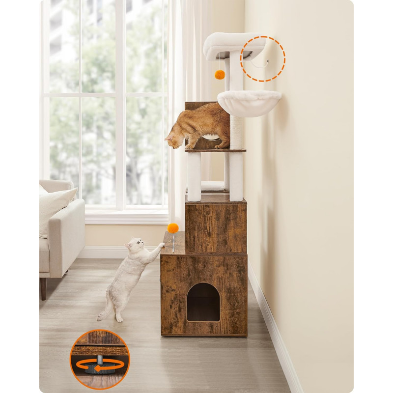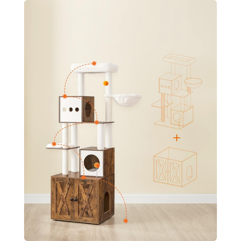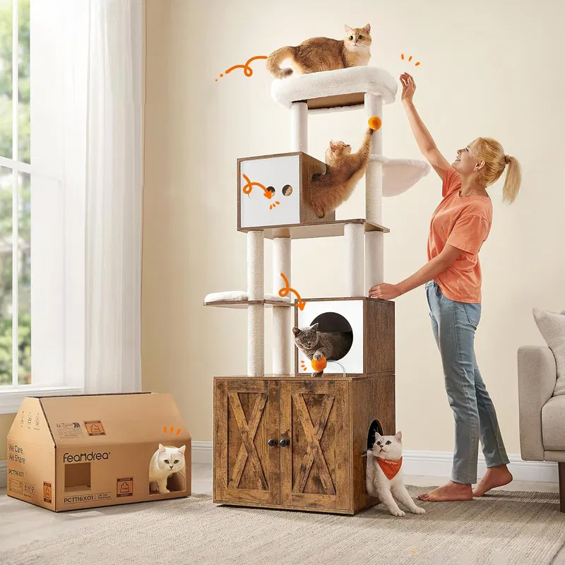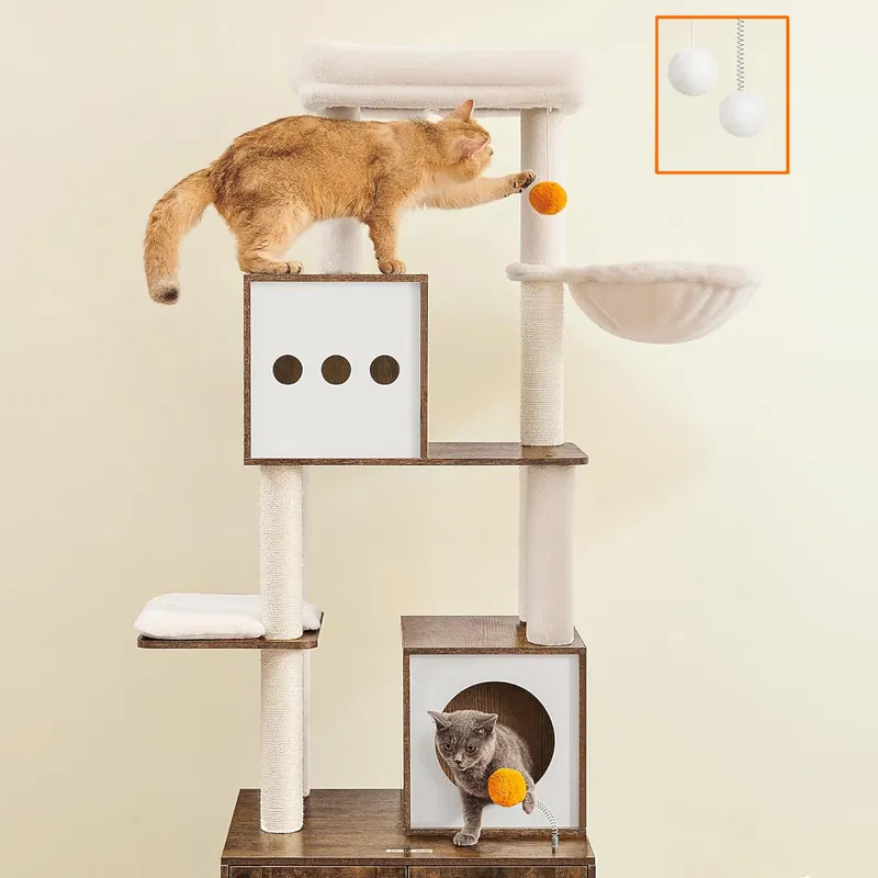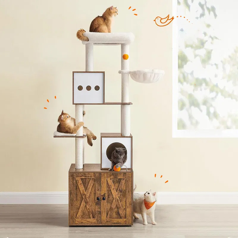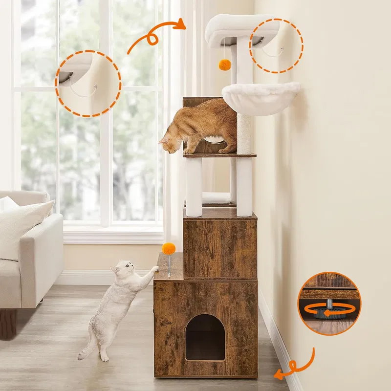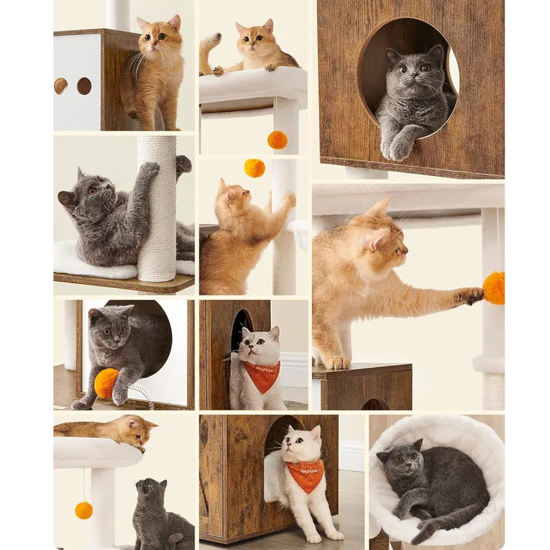 Scurta descriere: Ansamblul pentru pisici este o solutie completa pentru confortul si distractia animalului tau. Include atat zone de joaca si odihna, cat si un dulap discret pentru litiera, economisind spatiu si mentinand un aspect ordonat in locuinta. Designul pe mai multe niveluri permite pisicii sa se catere, sa observe si sa se relaxeze in voie.