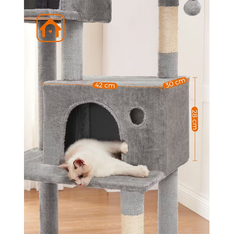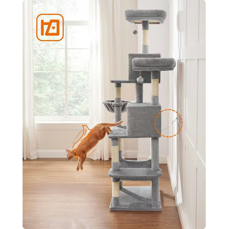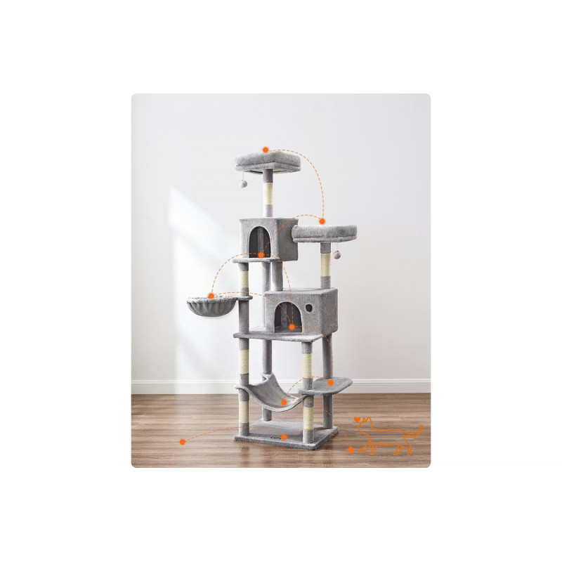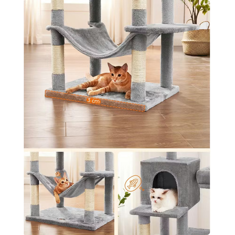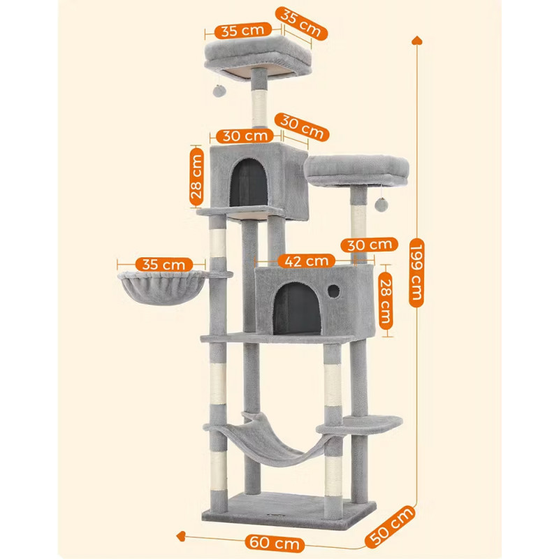 Scurta descriere: Ansamblul pentru pisici de 199 cm este ideal pentru pisicile active care adora sa se catere si sa observe de la inaltime. Ofera multiple spatii de joaca si relaxare, inclusiv platforme moi, ascunzatori si hamac confortabil. Structura stabila si materialele de calitate asigura siguranta si durabilitate in utilizare.